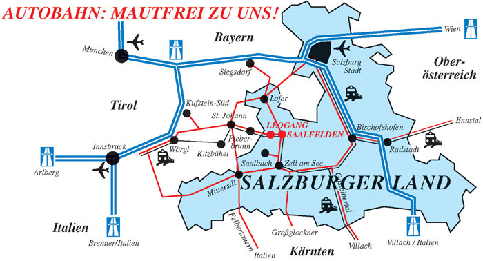 Wenn Sie von Wien - Linz kommen: Ausfahrt Salzburg- Wals Richtung Bad Reichenhall, über Unken und Lofer weiter Richtung Saalfelden, in Saalfelden beim 1. Kreisverkehr rechts abbiegen Richtung Leogang. Siehe oben.