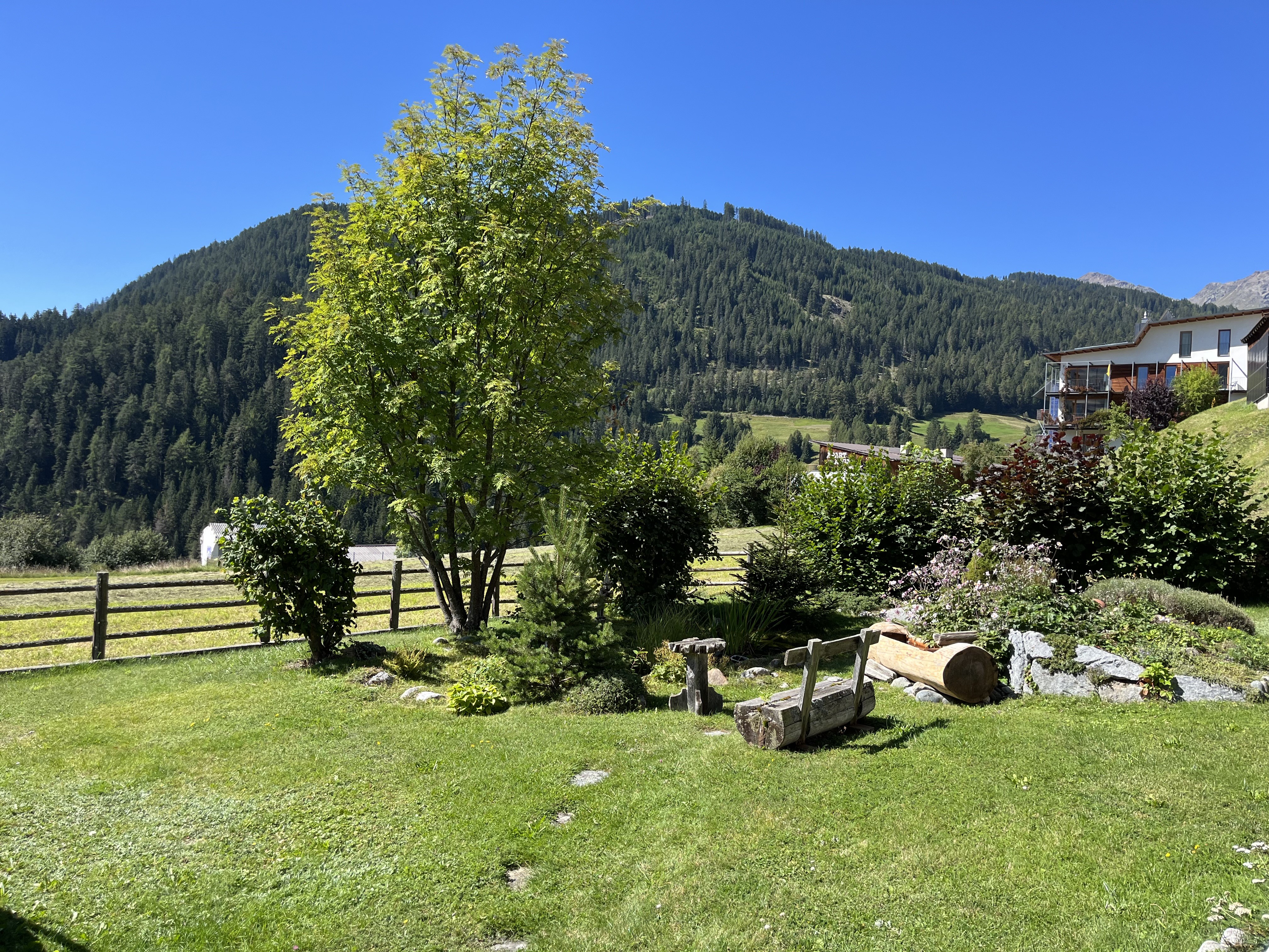 Sommer am Matinesweg: 600qm große Gartenlandschaft direkt am Haus mit Liegewiese, urigem Tiroler Gartenhaus mit Terrasse und Grillmöglichkeit, Steingarten und Gartenteich.