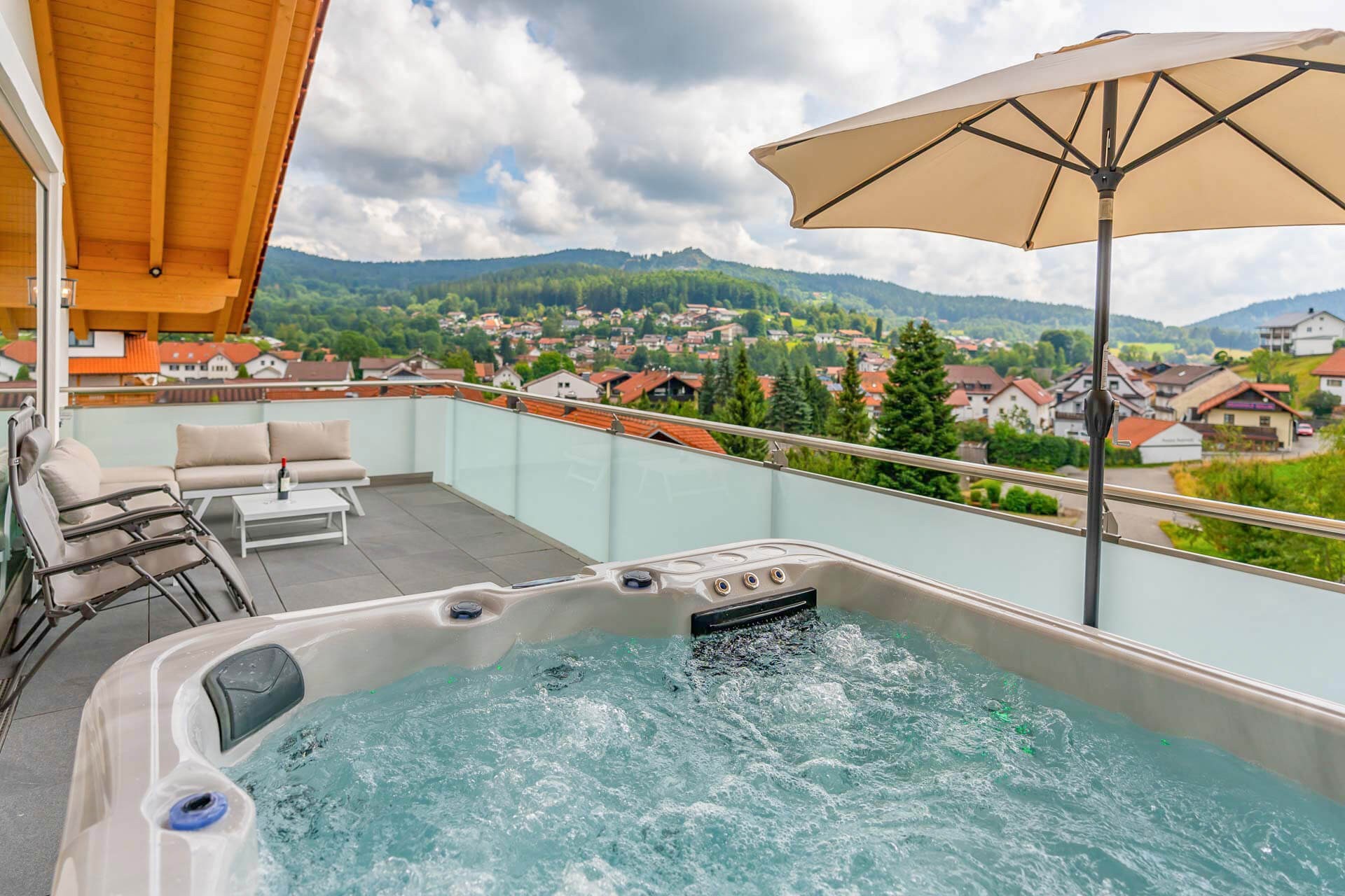 Großer Südbalkon, schöner Ausblick und privater Whirlpool - hier kann man es sich gut gehen lassen!