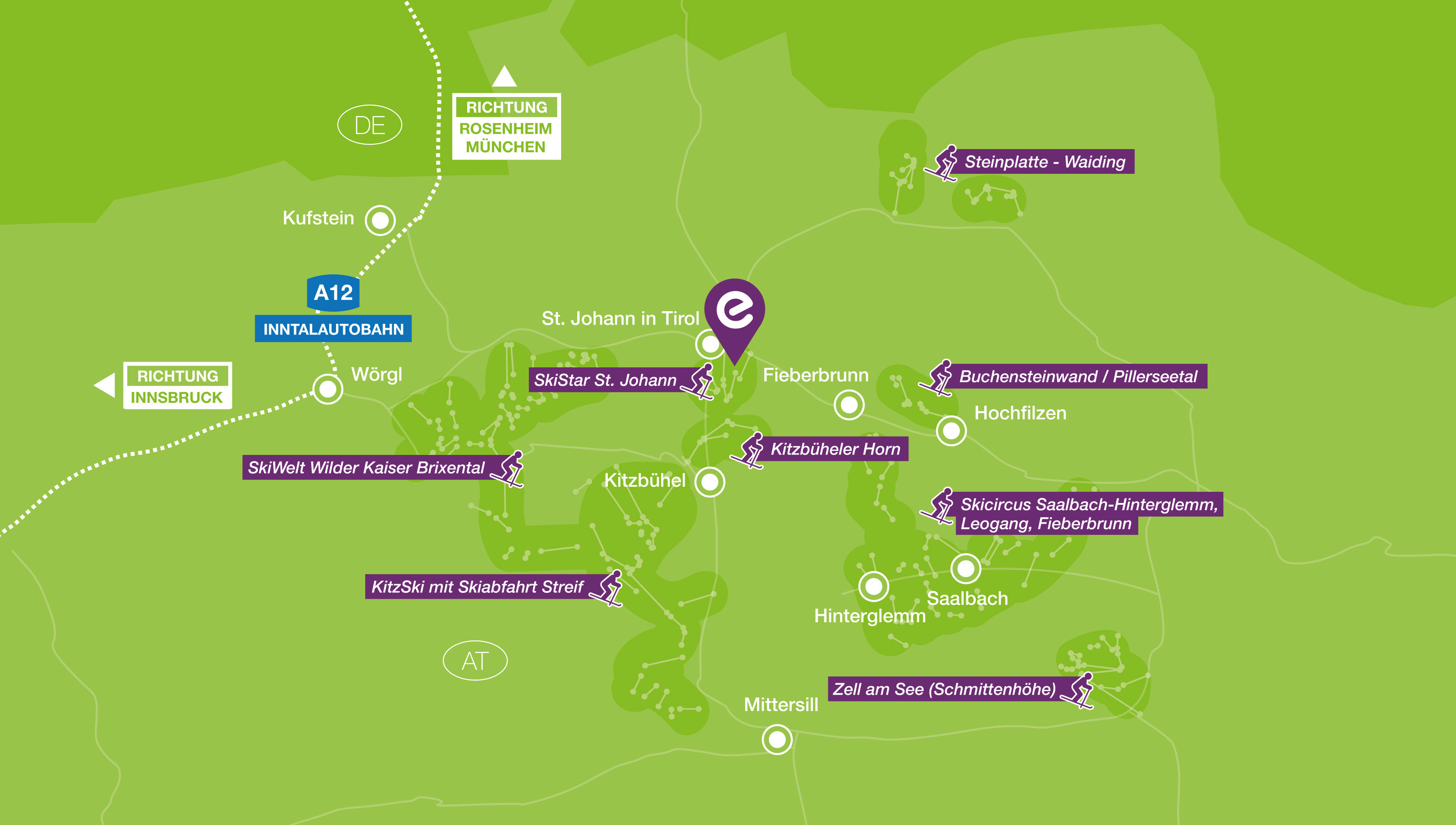 Mit dem Auto:A12 Ausfahrt 17-Wörgl-Ost oder A12 Ausfahrt 6-Kufstein-Süd & weiter auf E641