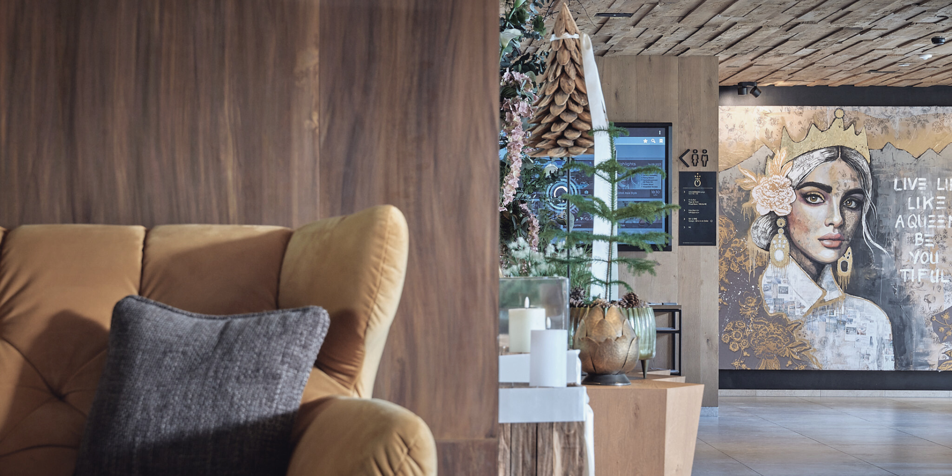 Die Lobby der HOCHKÖNIGIN in Maria Alm ist mehr als ein Eingangsbereich – sie ist ein Statement. Kunstvolle Details, modernes Design und warme Materialien schaffen eine Atmosphäre zwischen Galerie und Wohlfühlort. Das imposante Wandkunstwerk mit der Aufschrift „Live life like a Queen – be you tiful“ symbolisiert die Philosophie des Hauses: Stil, Stärke und Selbstbewusstsein. Perfekt für Designliebhaber, die im Boutiquehotel im Salzburger Land Inspiration und Ästhetik suchen.#Hochkoenigin #MariaAlm #Designhotel #Lobby #Kunst #SalzburgerLand #Architektur #InteriorDesign #Hotel #Boutiquehotel #Lifestylehotel #Designliebe