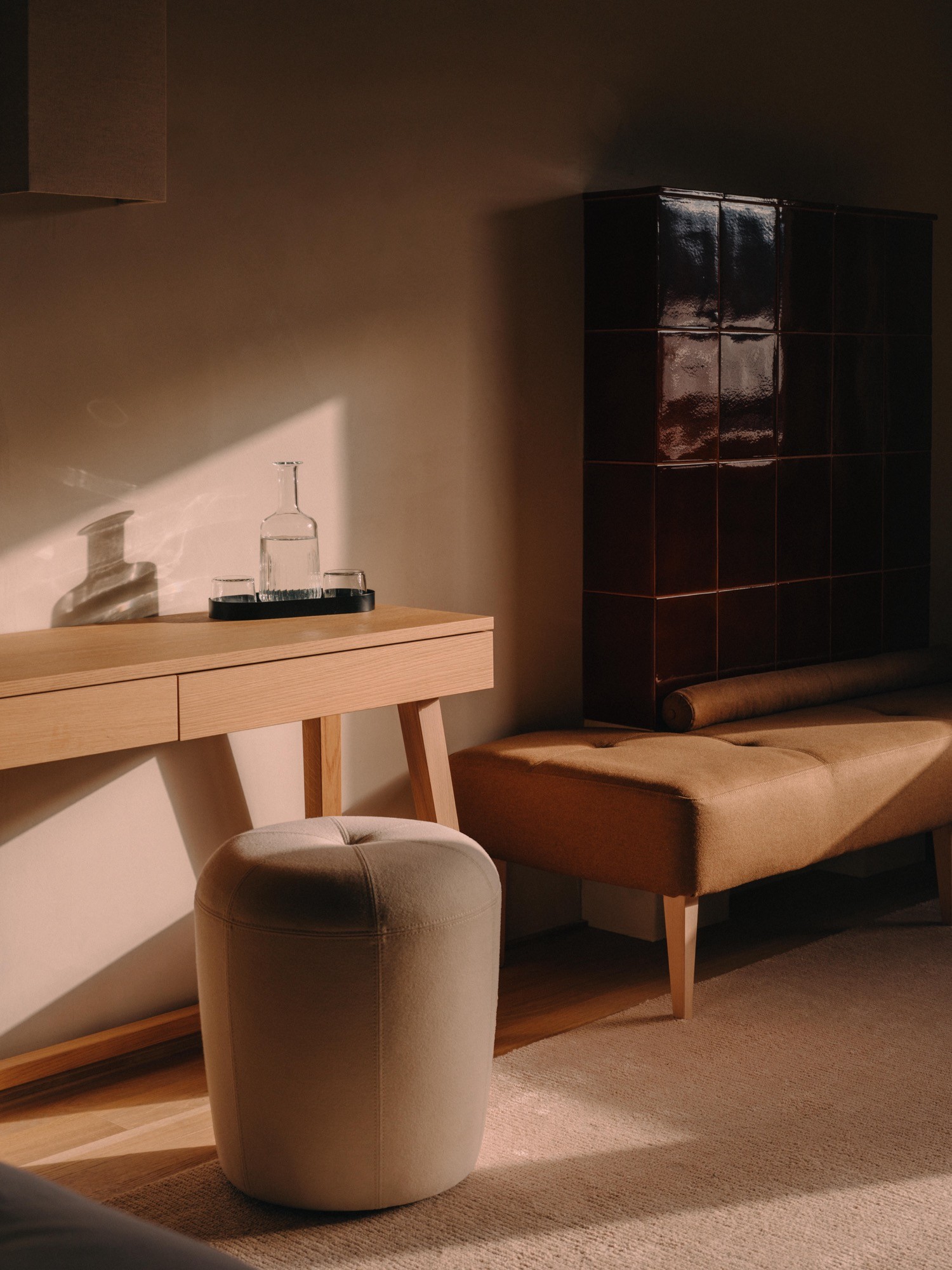 In den Zimmern des Hotel Schwarzwand hat ein neues Kapitel begonnen. Architektin Birgit Elsensohn setzt auf handwerklich hergestellte Polstermöbel und Betten, speziell eingefärbte Wollteppiche und Leinenstoffe und Marmorverkleidungen in sanften Tönen. Kalkspachtelungen an den Wänden sorgen für ein behagliches Raumklima. Bei den Holzvertäfelungen aus gebürsteter Eiche ließ sich Birgit von traditionellen alpinen Stilelementen inspirieren. Durch die Maserung der geometrischen Flächen entstehen subtile Licht- und Schattenspiele.