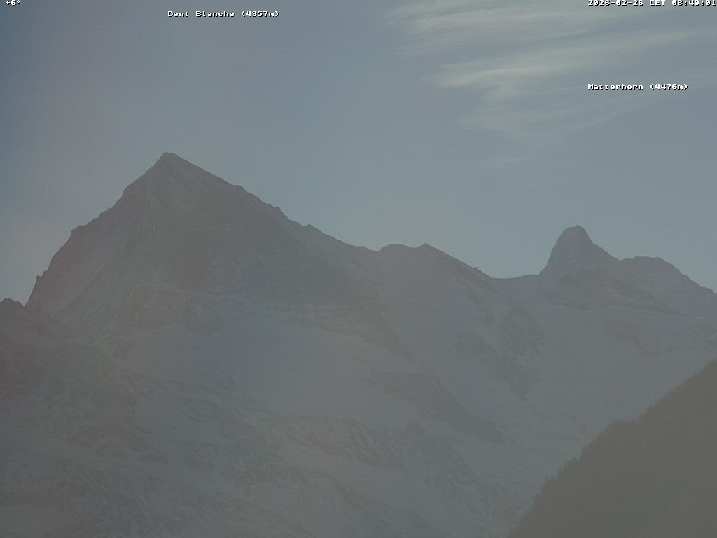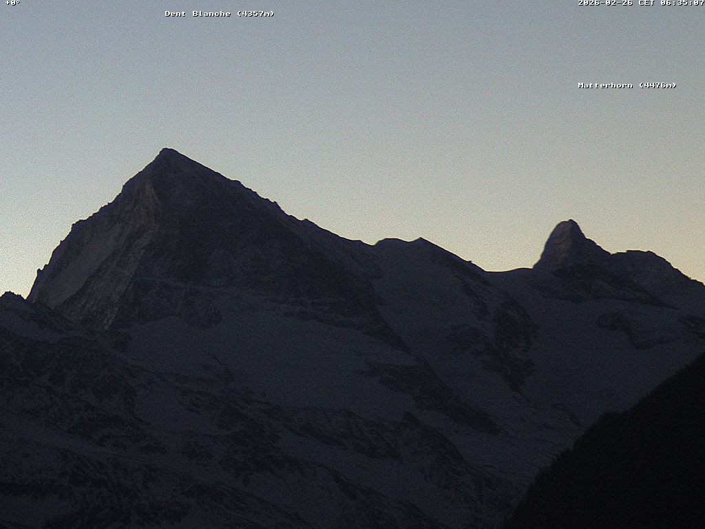 Archiviertes Webcam Bild: 4 Vallées: Blick Richtung Dent Blanche und Matterhorn am 26 Feb 2026 um 06:22 Uhr 05:00