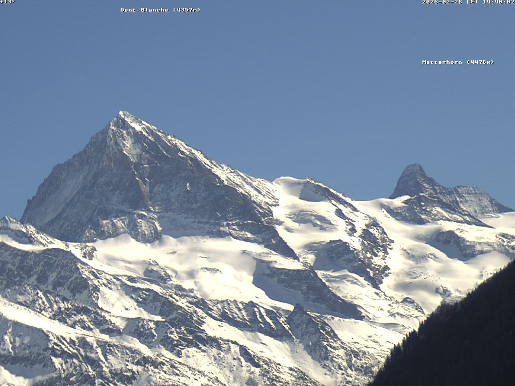 Archiviertes Webcam Bild: 4 Vallées: Blick Richtung Dent Blanche und Matterhorn am 26 Feb 2026 um 14:22 Uhr 13:00