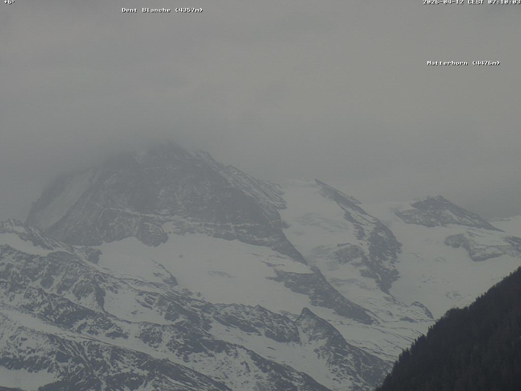 Archiviertes Webcam Bild: 4 Vallées: Blick Richtung Dent Blanche und Matterhorn am 12.04.2026 um 07:14 Uhr 07:00