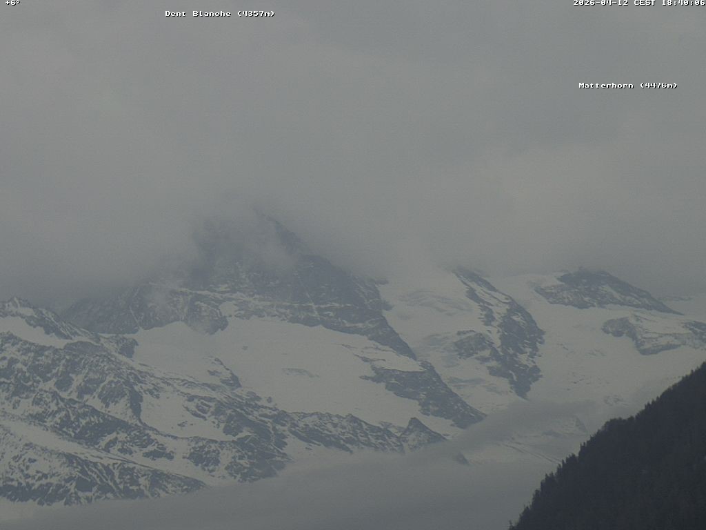 Archiviertes Webcam Bild: 4 Vallées: Blick Richtung Dent Blanche und Matterhorn am 12.04.2026 um 18:14 Uhr 18:00