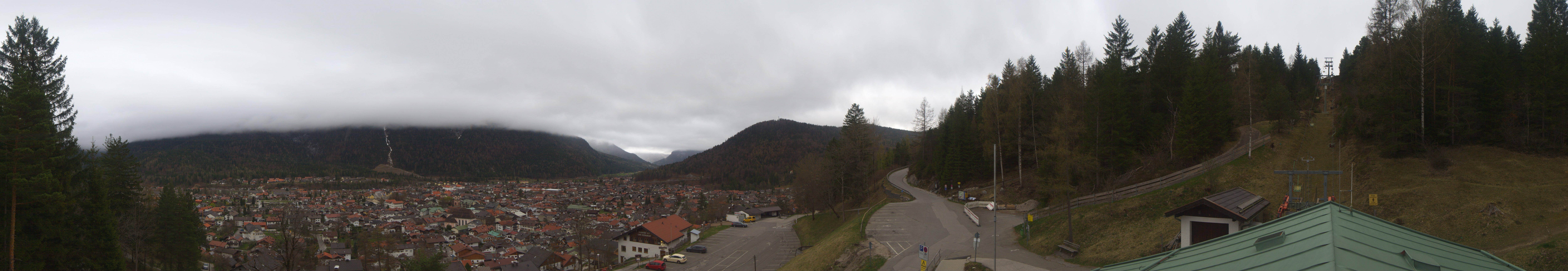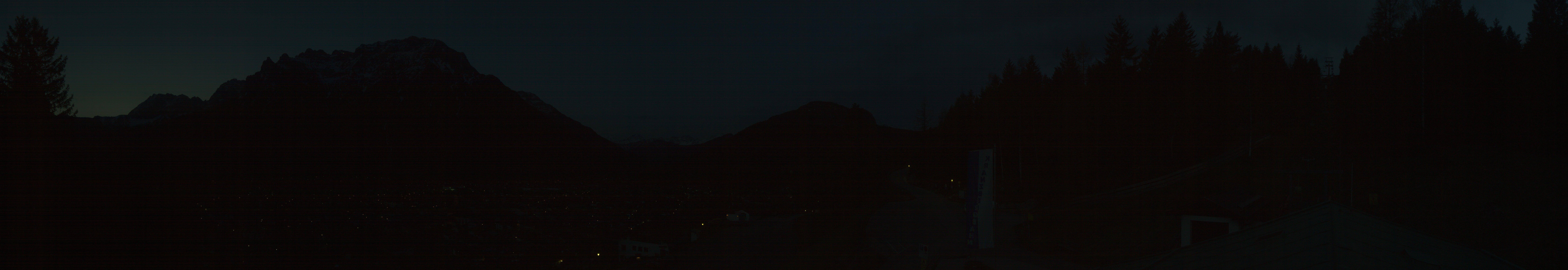 Die Kamera befindet sich an der Talstation des Kranzberg-Sessellifts und blickt über Mittenwald zur Alpenwelt Karwendel.