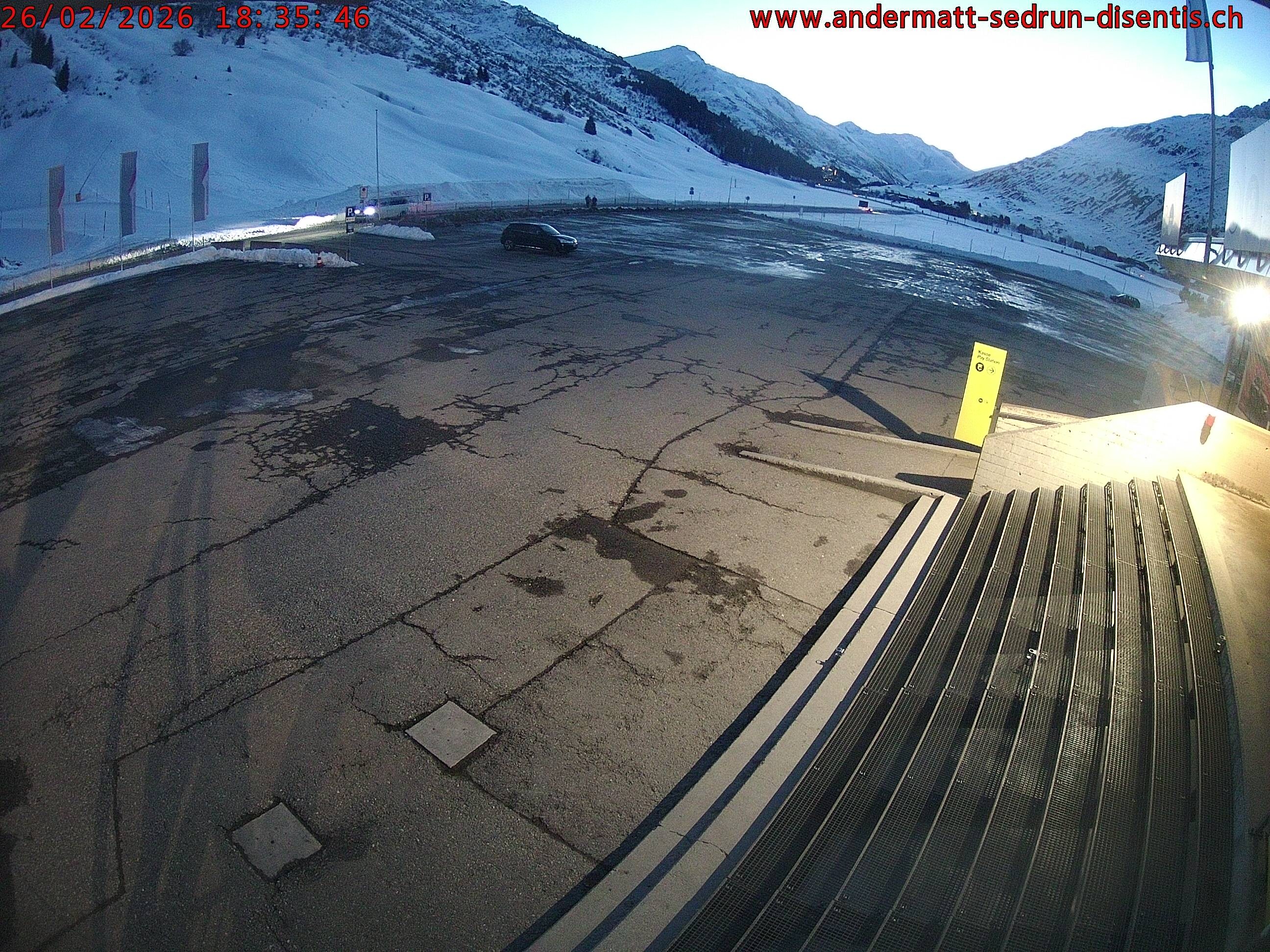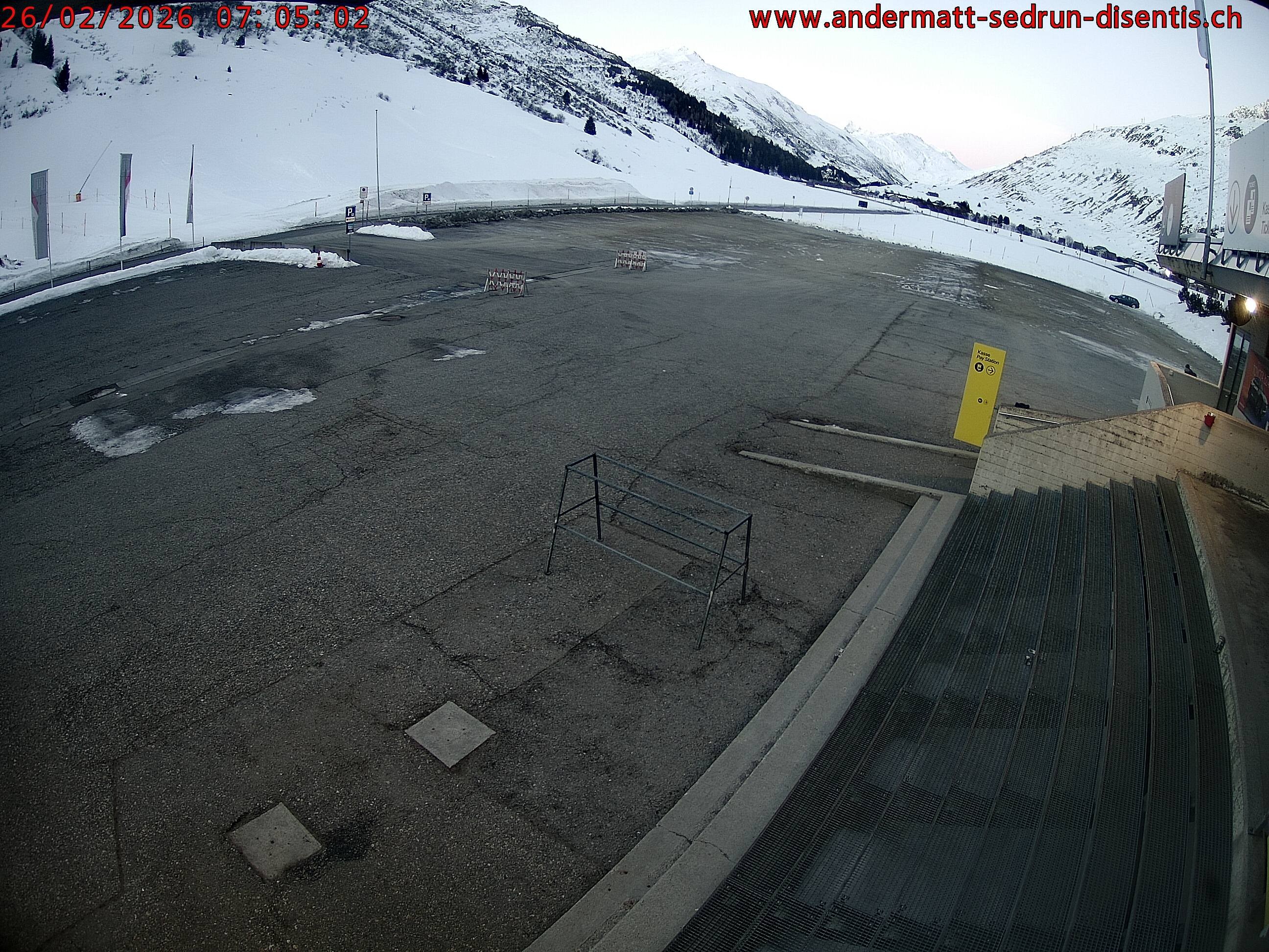 Archiviertes Webcam Bild: Andermatt: Parkplatz Gemsstockbahn am 26 Feb 2026 um 06:56 Uhr 05:00