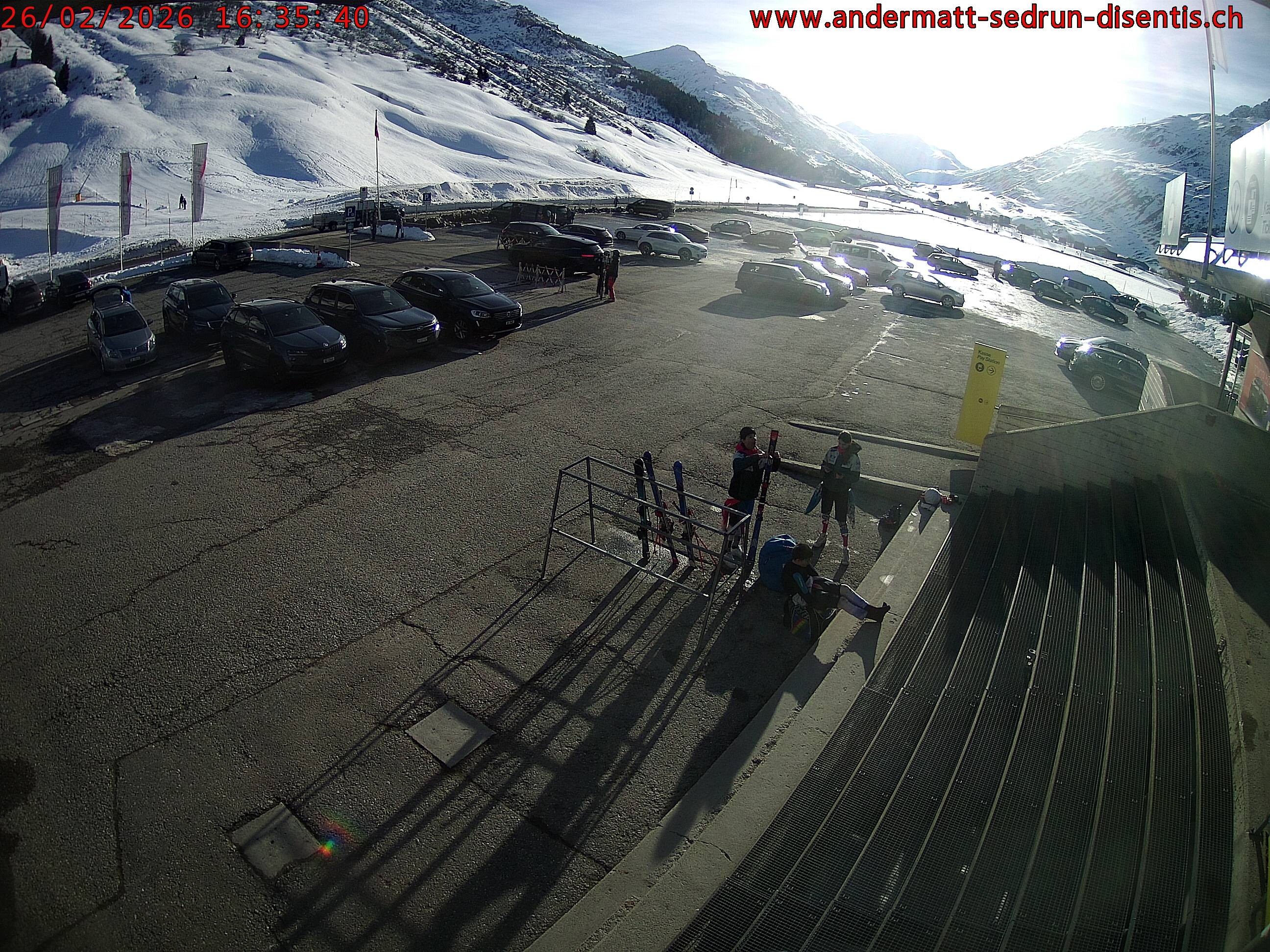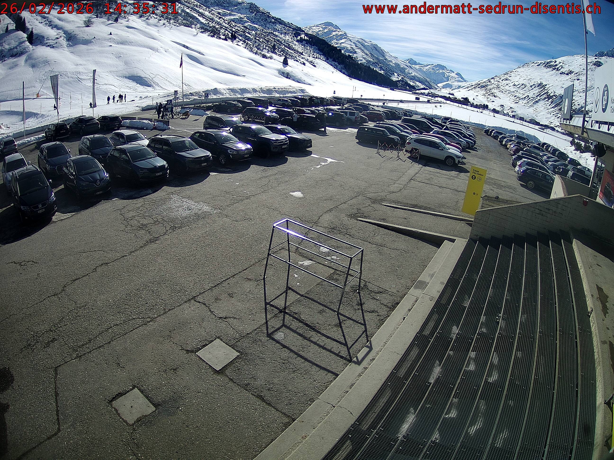 Archiviertes Webcam Bild: Andermatt: Parkplatz Gemsstockbahn am 26 Feb 2026 um 14:56 Uhr Aktuell