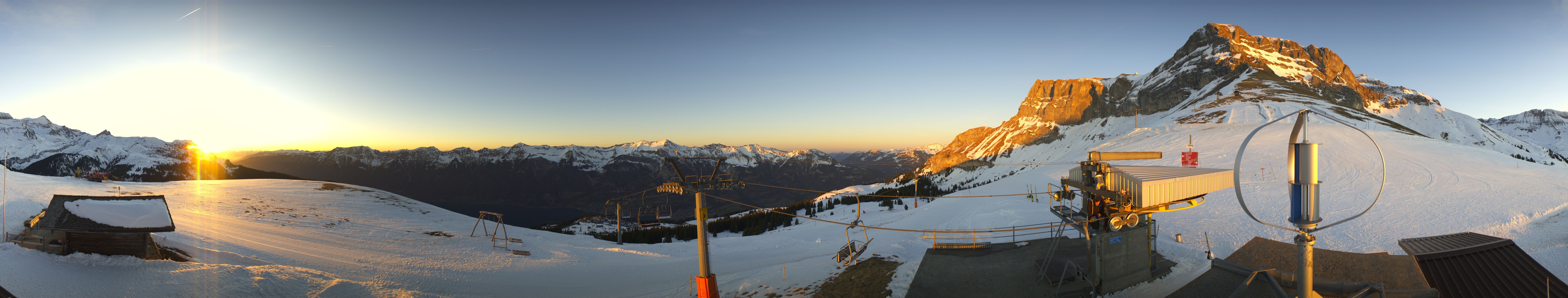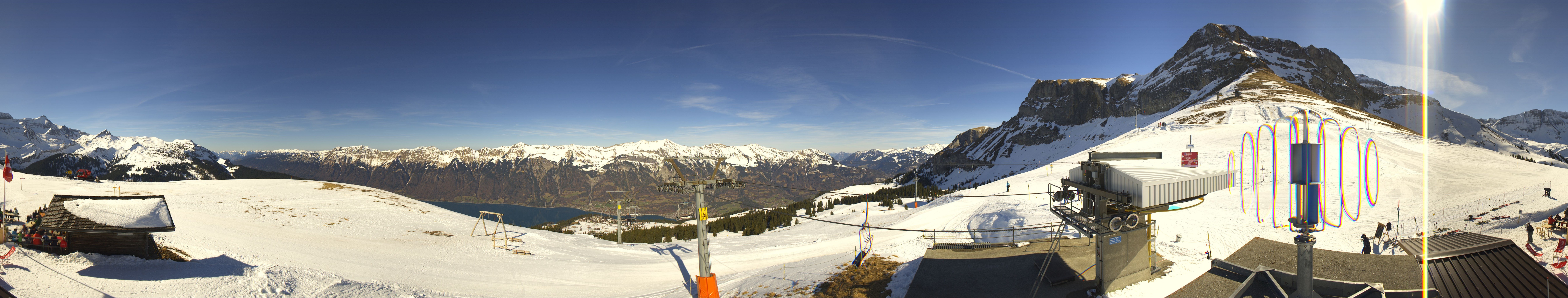 Toller 360-Grad-Blick ins Skigebiet Axalp ob Brienz. Die Panorama-Webcam ist an der Bergstation der Windegg-Sesselbahn positioniert.