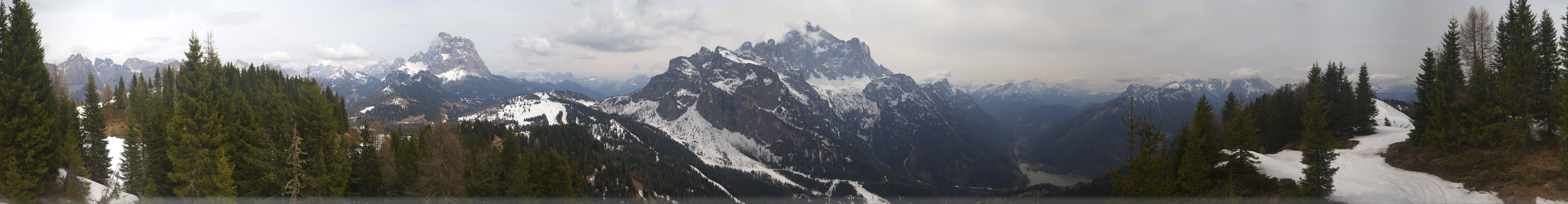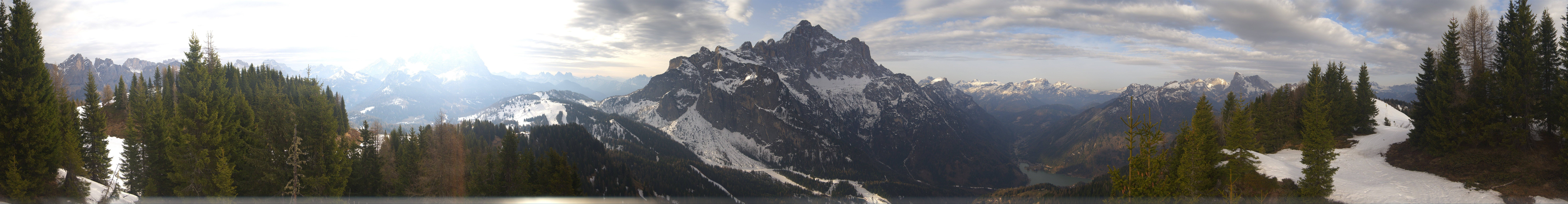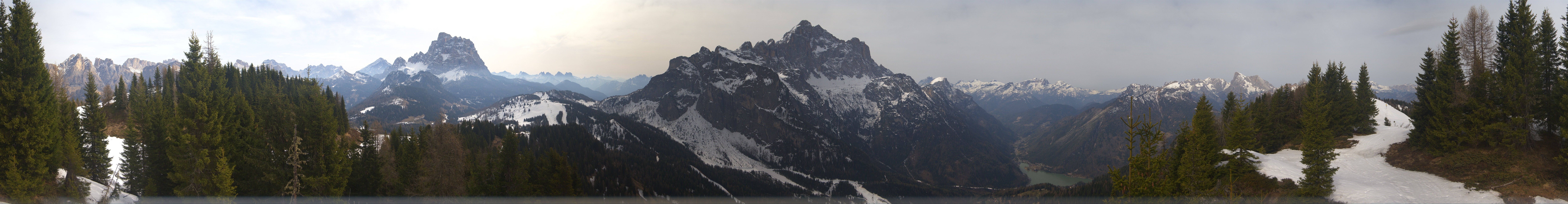 Die Panoramakamera blickt von der Bergstation des Fertazza Sessellifts auf die umliegende Bergwelt Bellunos. Zu sehen sind u.a. die Gipfel des Monte Pelmo (3168 m) und Monte Civetta (3220 m).