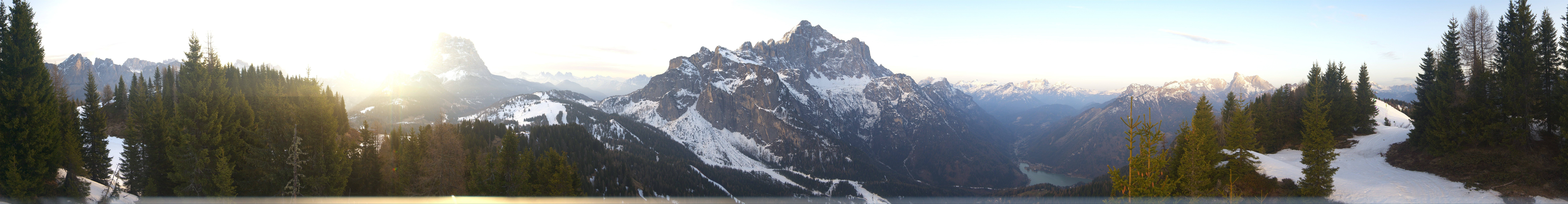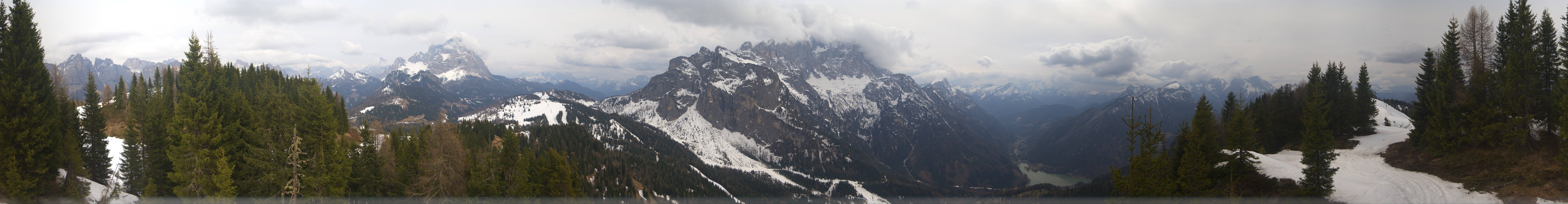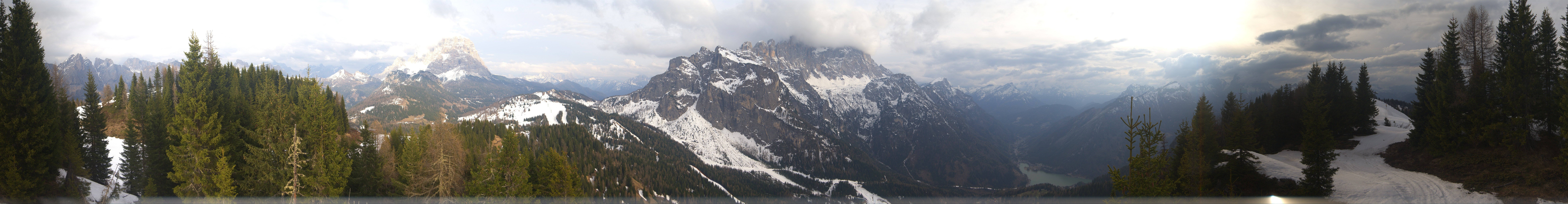 Die Panoramakamera blickt von der Bergstation des Fertazza Sessellifts auf die umliegende Bergwelt Bellunos. Zu sehen sind u.a. die Gipfel des Monte Pelmo (3168 m) und Monte Civetta (3220 m).