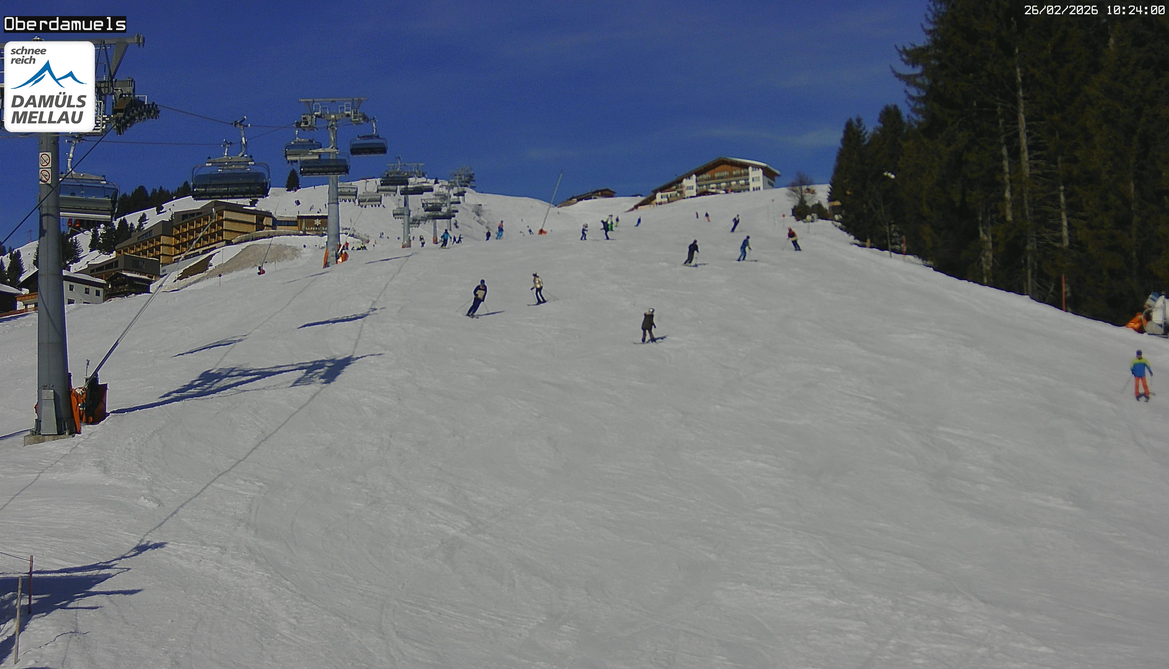 Archived webcam image showing Damüls Ski Resort: View Base Station Oberdamüls on 26 Feb 2026 at 10:34 09:00