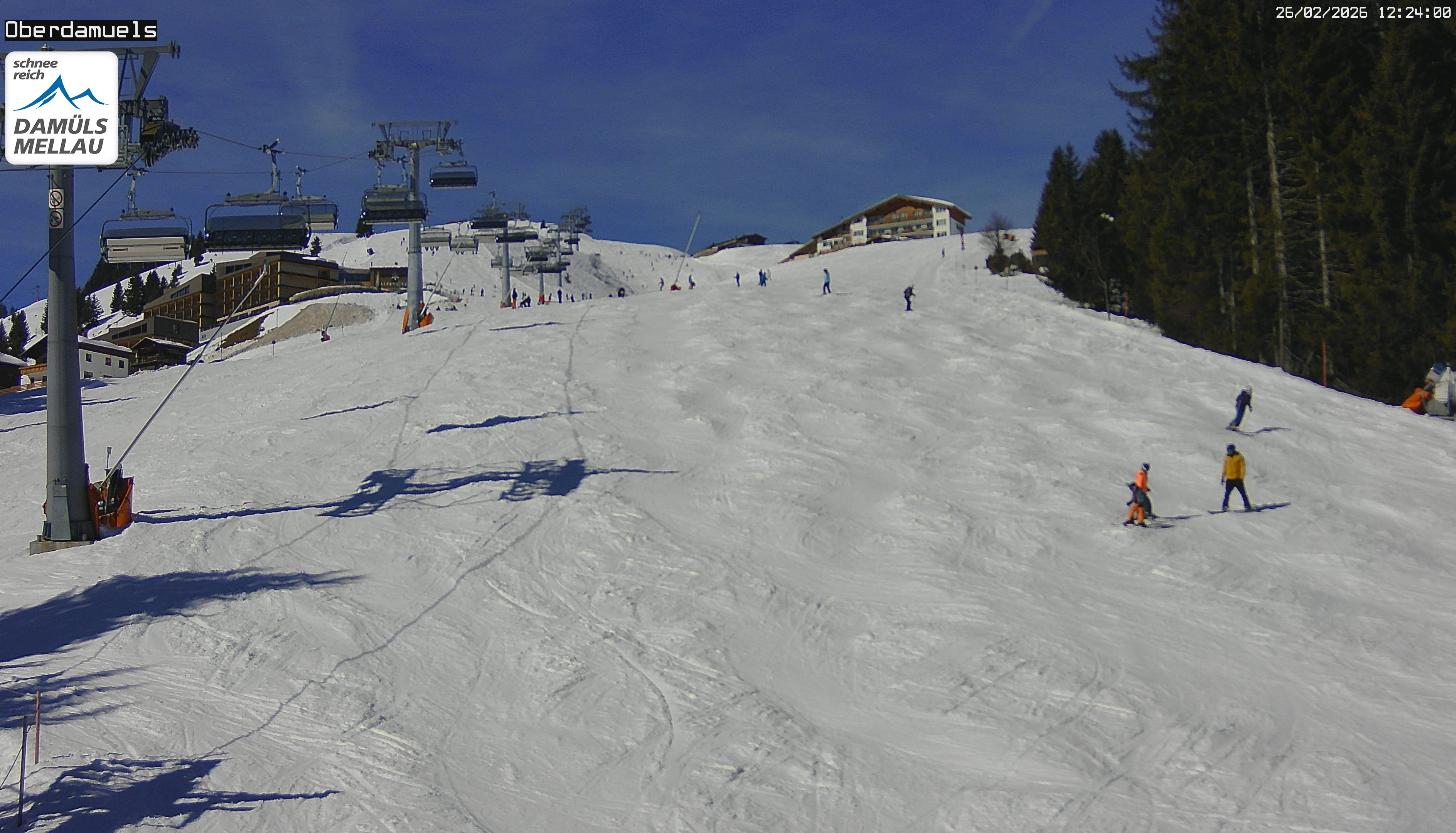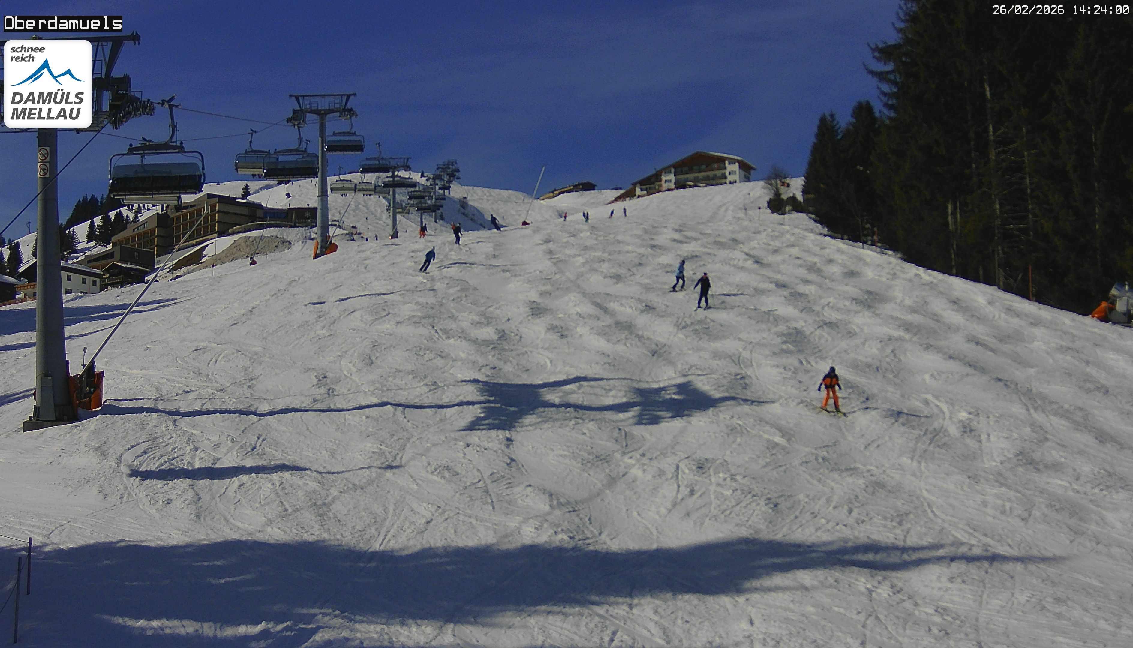 Archived webcam image showing Damüls Ski Resort: View Base Station Oberdamüls on 26 Feb 2026 at 14:34 Aktuell