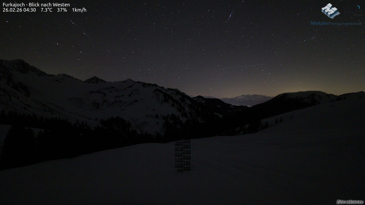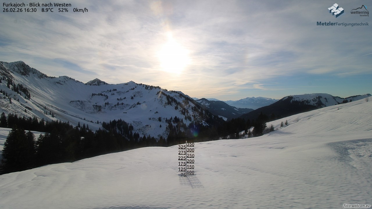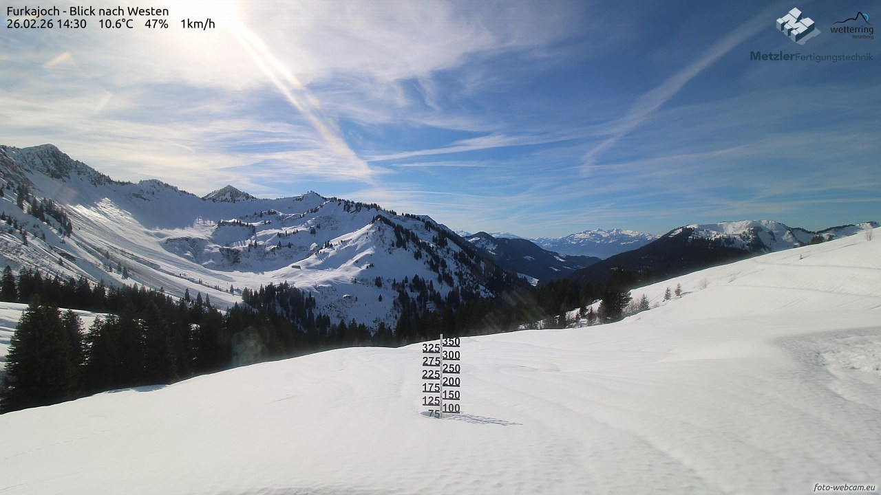 Die Webcam befindet sich am Furkajoch und zeigt den Blick nach Westen Richtung Kreuzspitze, Gerenspitze, Hochgerach, Säntis, Gapfohler Falba und Nob.