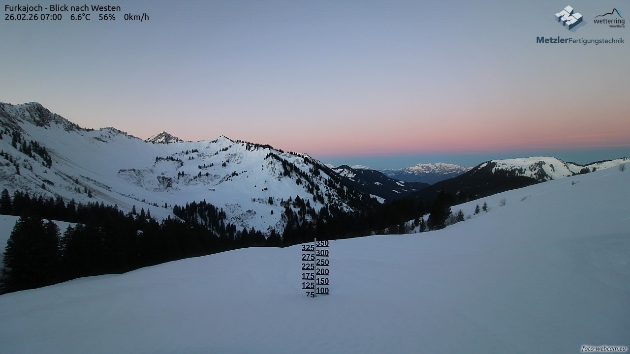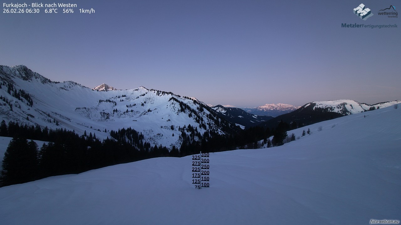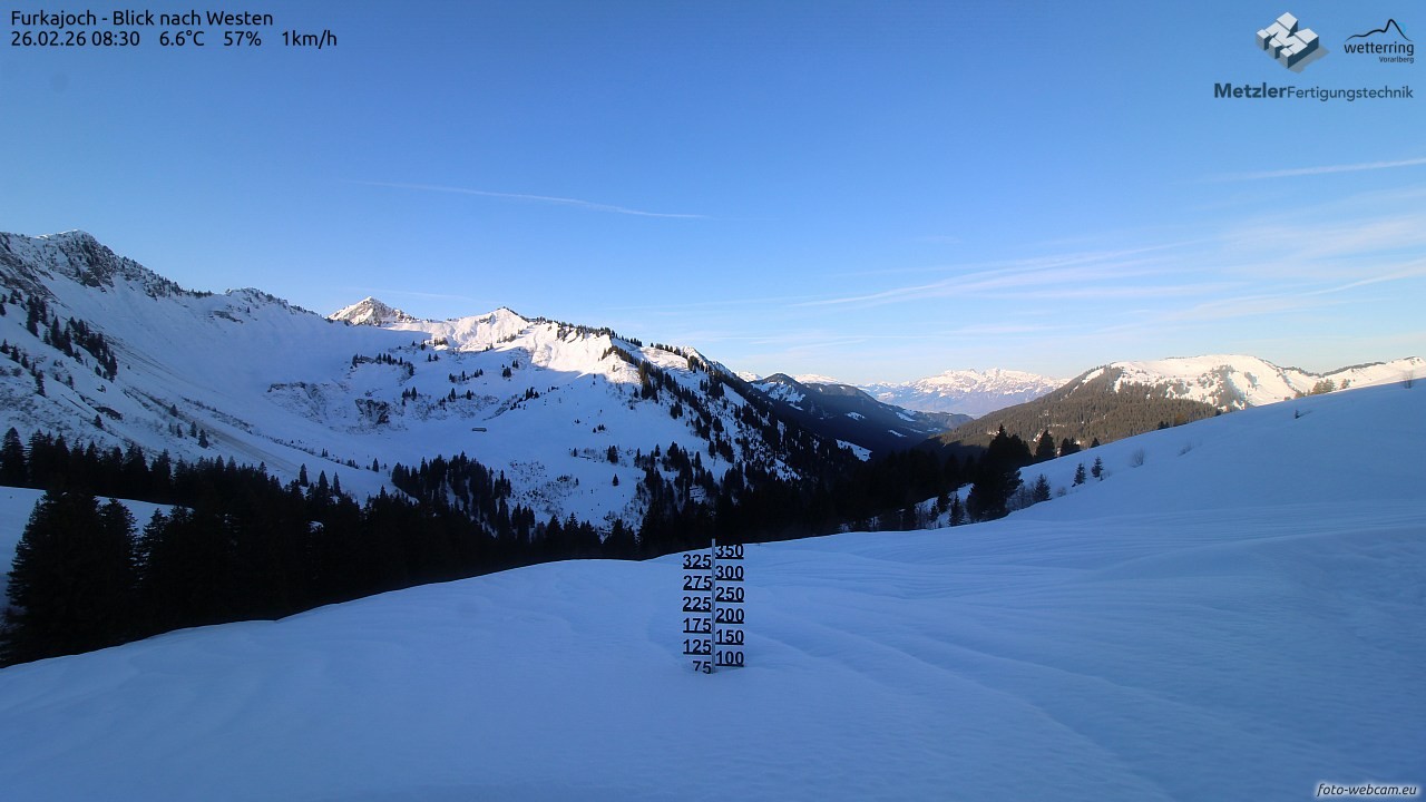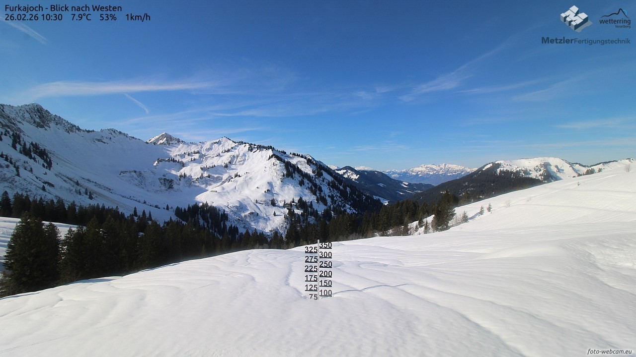Die Webcam befindet sich am Furkajoch und zeigt den Blick nach Westen Richtung Kreuzspitze, Gerenspitze, Hochgerach, Säntis, Gapfohler Falba und Nob.