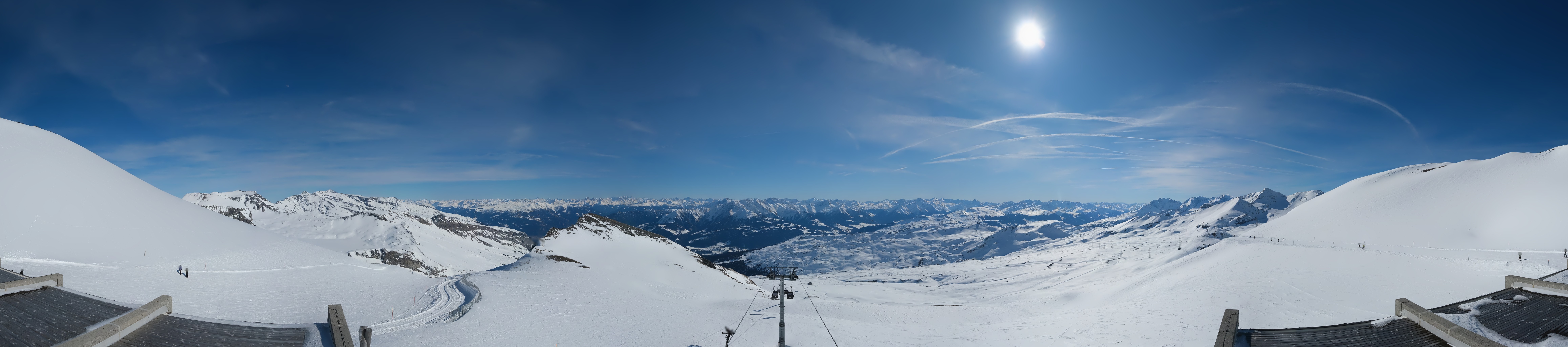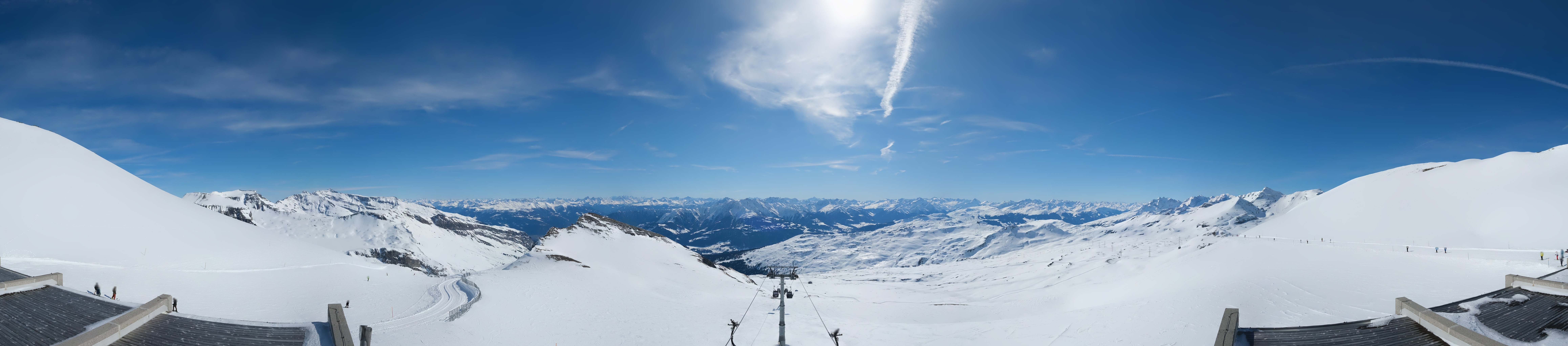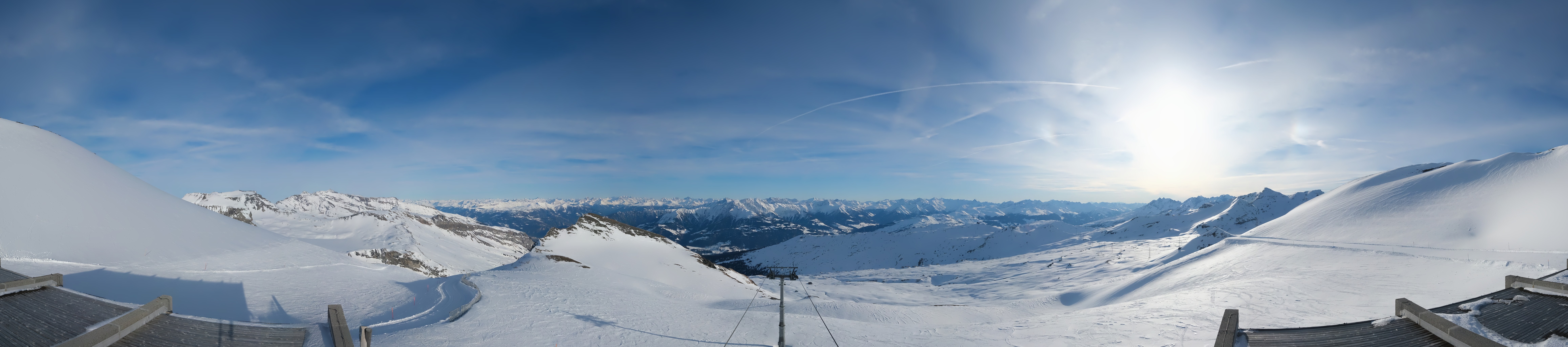 Direkt an der Bergstation von La Siala im Schweizer Skigebiet Laax gelegen, bietet die Roundshot-Cam einen fantastischen 360-Grad-Blick auf das Skigebiet und seine atemberaubende Berglandschaft.