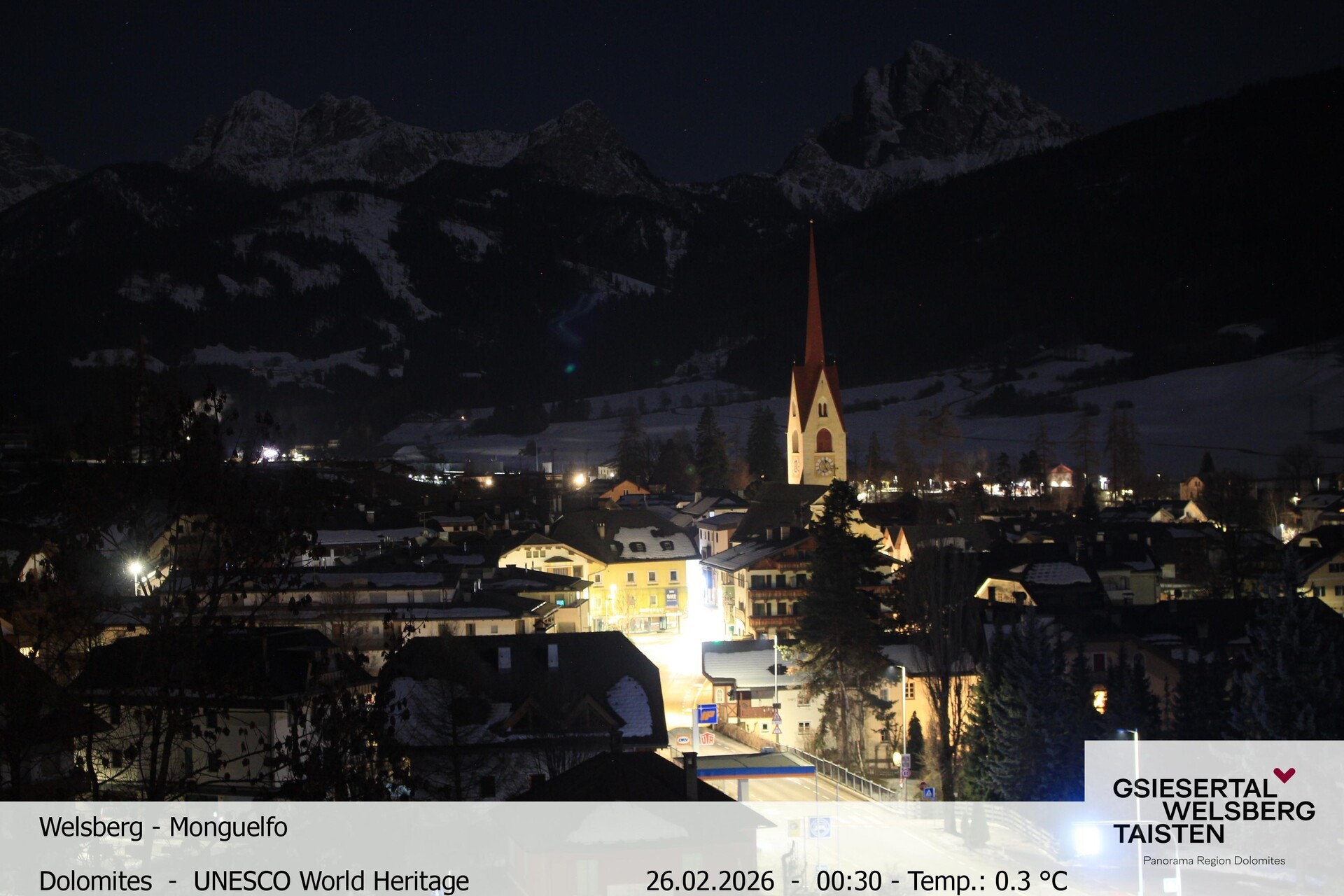 Archiviertes Webcam Bild: Blick auf Welsberg (Gsieser Tal, Südtirol) am 26 Feb 2026 um 02:10 Uhr 01:00