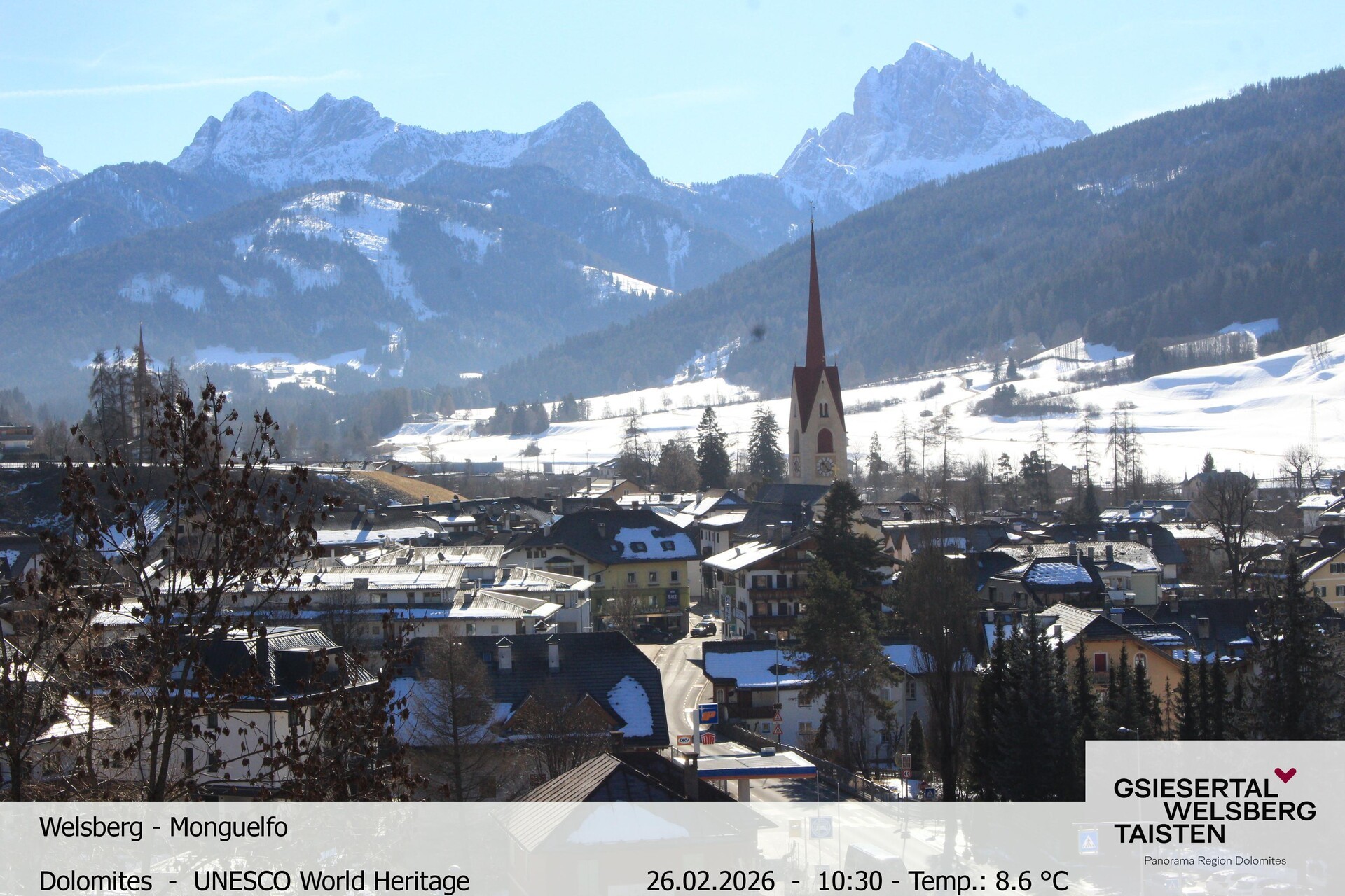 Archiviertes Webcam Bild: Blick auf Welsberg (Gsieser Tal, Südtirol) am 26 Feb 2026 um 10:10 Uhr 09:00