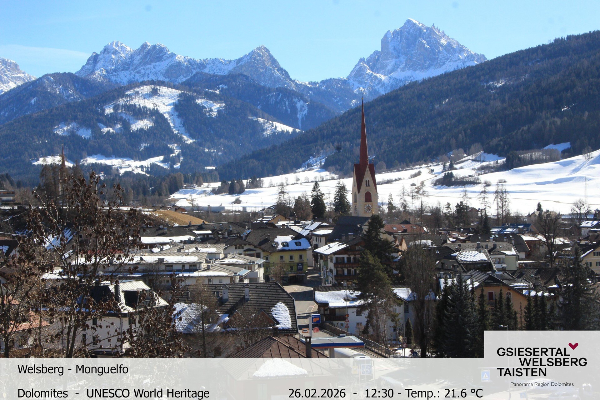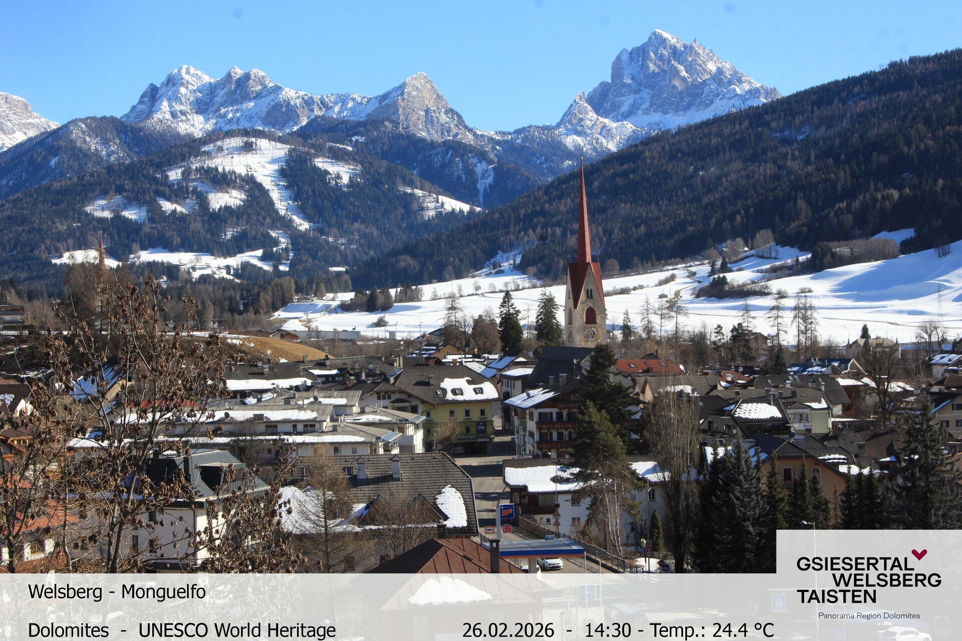 Archiviertes Webcam Bild: Blick auf Welsberg (Gsieser Tal, Südtirol) am 26 Feb 2026 um 16:10 Uhr Aktuell