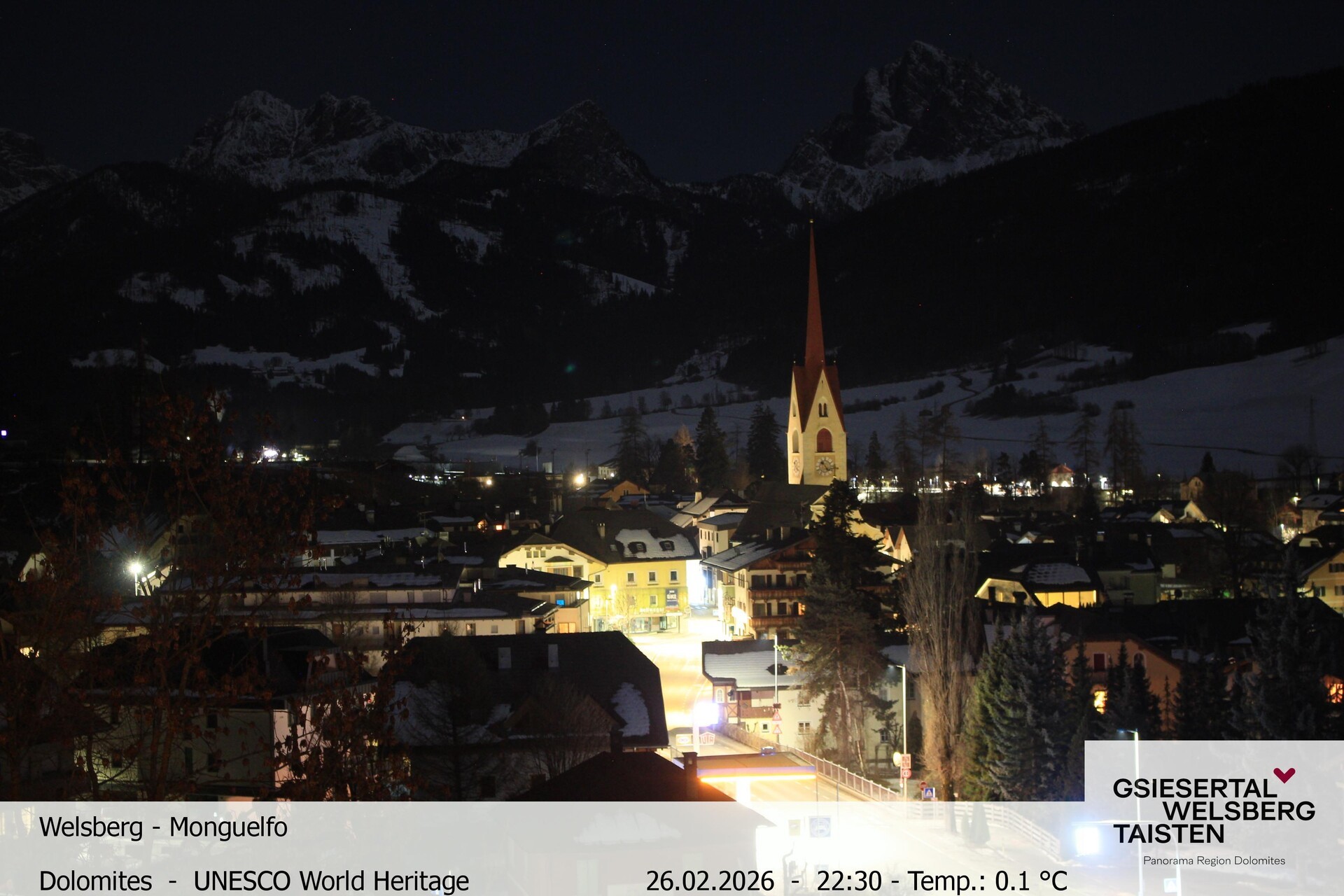Archiviertes Webcam Bild: Blick auf Welsberg (Gsieser Tal, Südtirol) am 26 Feb 2026 um 00:10 Uhr 23:00