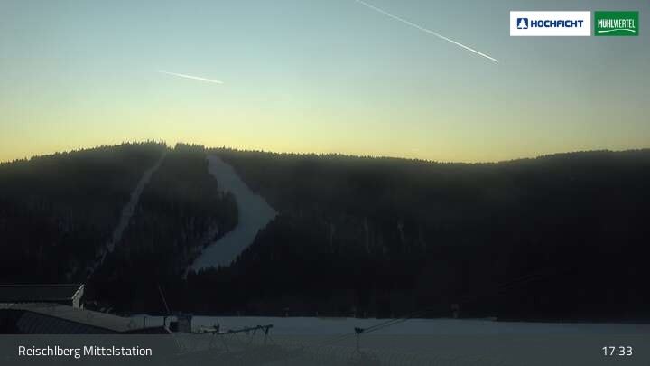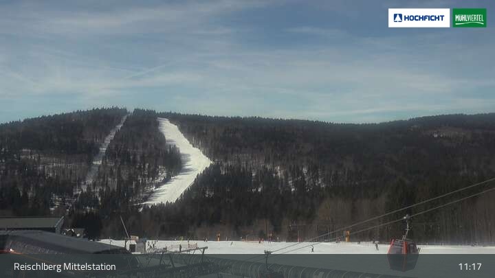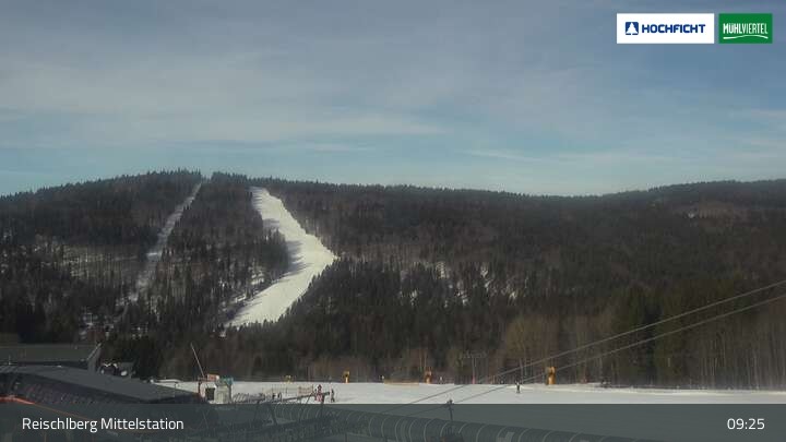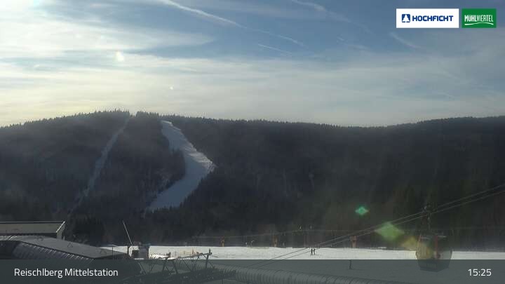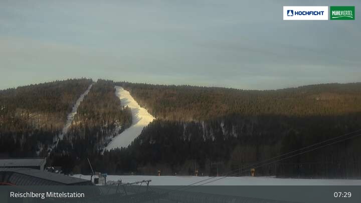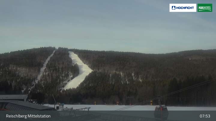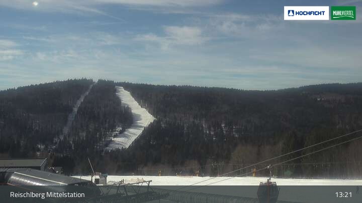 Ausblick von der Mittelstation Reischlberg im Skigebiet Hochficht. Man sieht von dort unter anderem auch die beiden Holzschlaglifte. Dort befindet sich neben mehreren blauen Abfahrten ein Förderband für Anfänger, ein kleiner Spielplatz und ein Gasthaus.