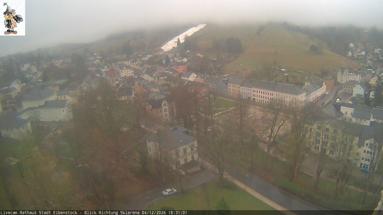 Hier zu sehen ist der Blick vom Rathaus in Eibenstock auf den Skihang bei Wurzelrudis Erlebniswelt. Das Skigebiet liegt mitten im Erzgebirge südlich der Stadt Eibenstock und befindet sich am Nordhang des Adlerfelsen.