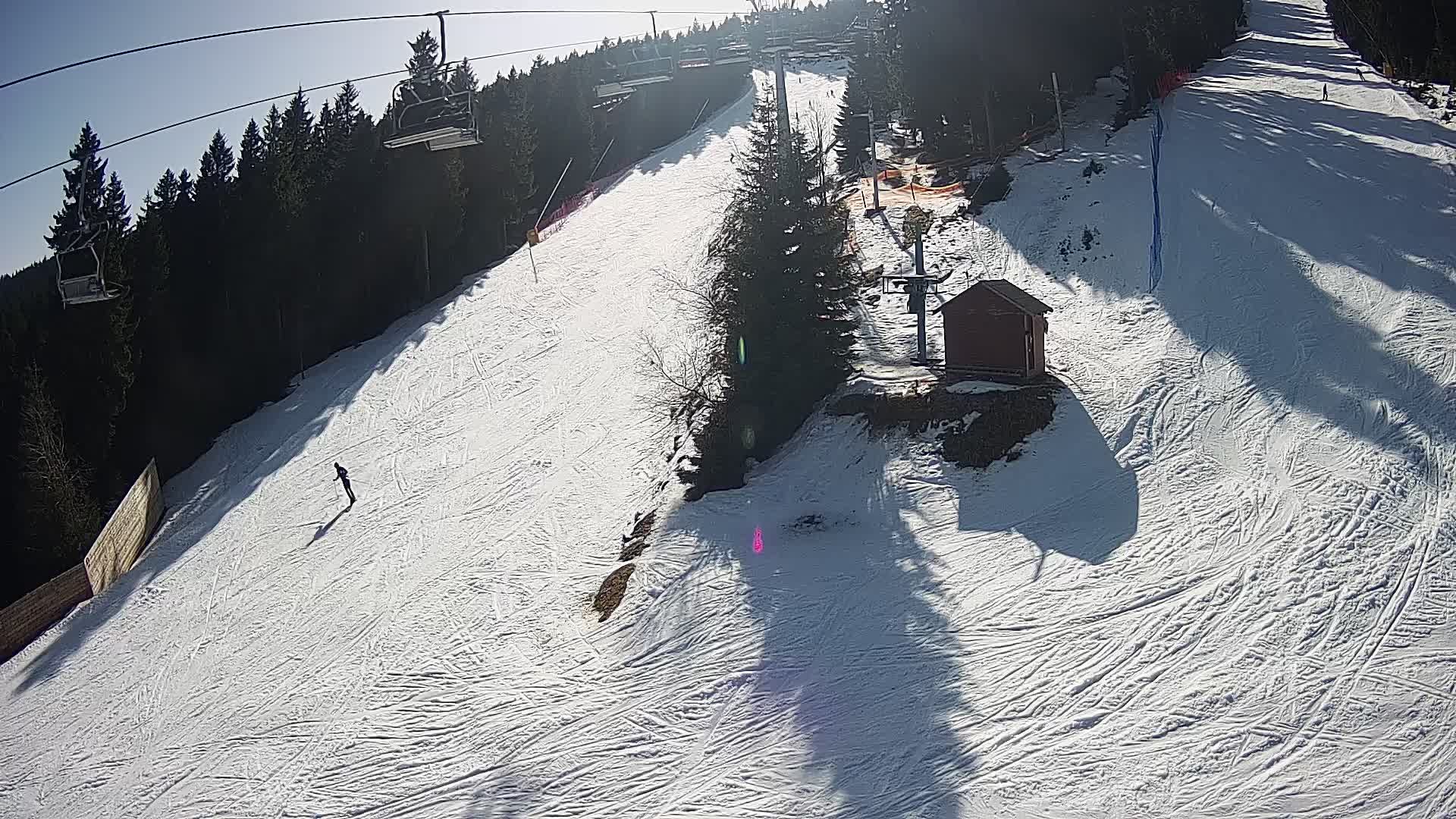 Aussicht vom Keilberg ins Erzgebirge. Im Blickfeld dieser Webcam ist der 4er-Sessellift Suzuki, der die Wintersportler auf den Keilberg bringt. Darunter befinden sich die beliebte, rot gekennzeichnete Piste Nummer 8, die mit ihren 1650 Metern Länge zu den längsten Pisten im Skigebiet zählt.