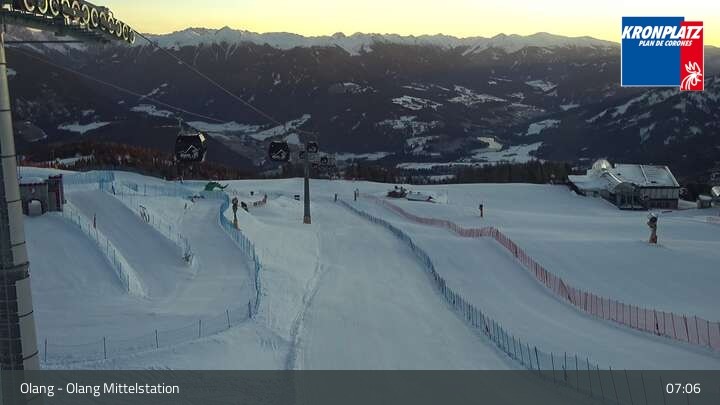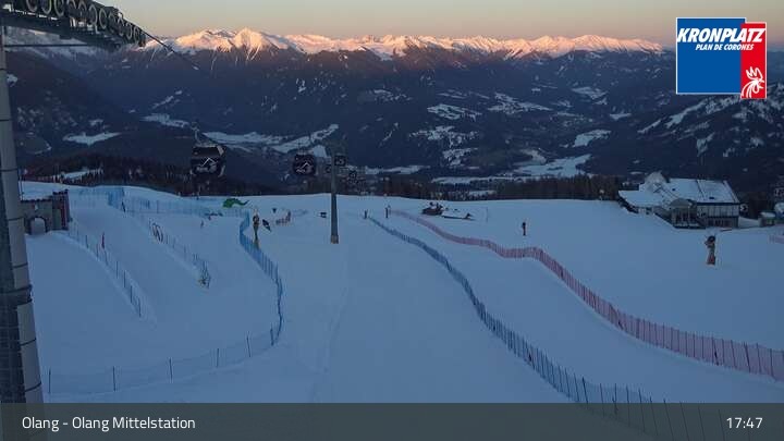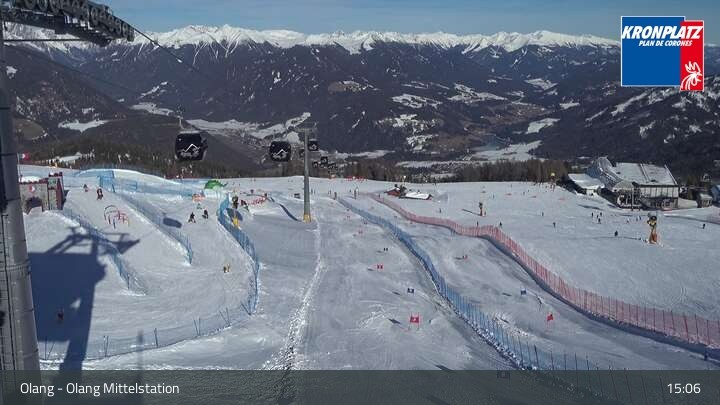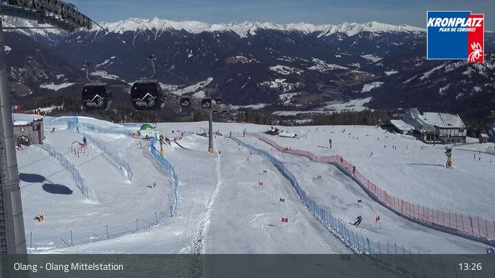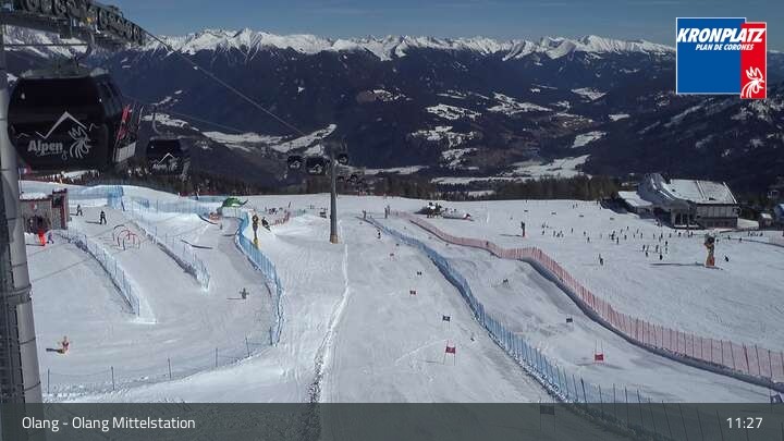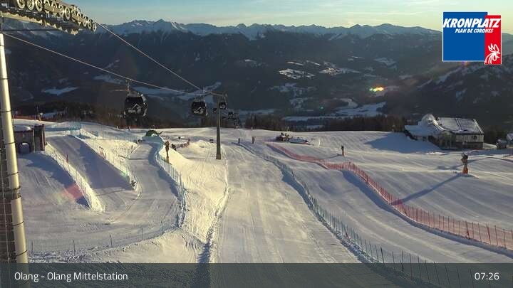 Die Webcam befindet sich an der Mittelstation, wo sich die Gondelbahnen Olang 1° und Olang 2° treffen. Sie blickt auf die Pisten des umliegenden Skigebiets Kronplatz.