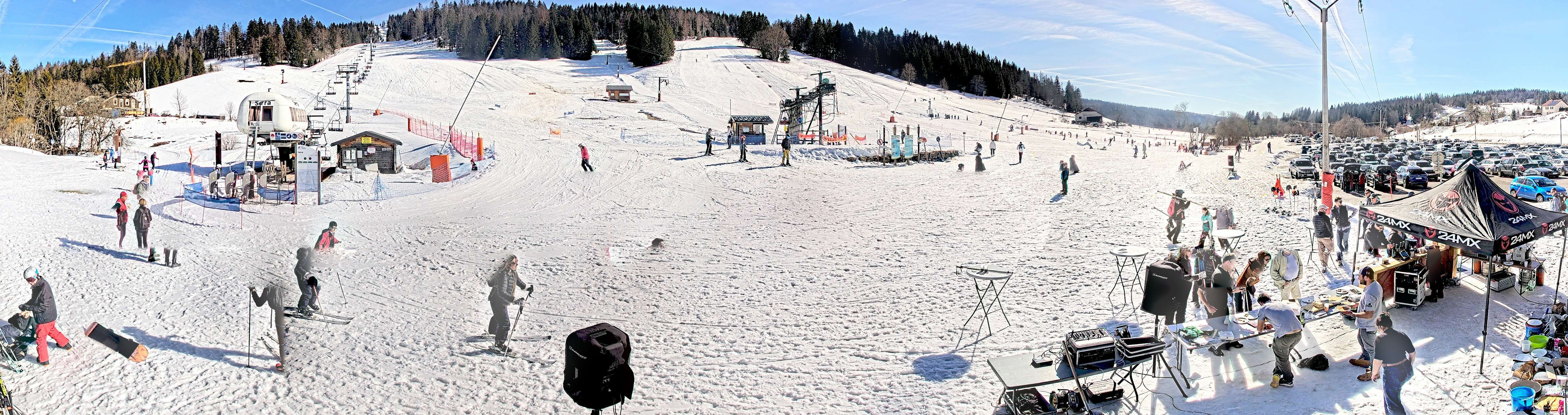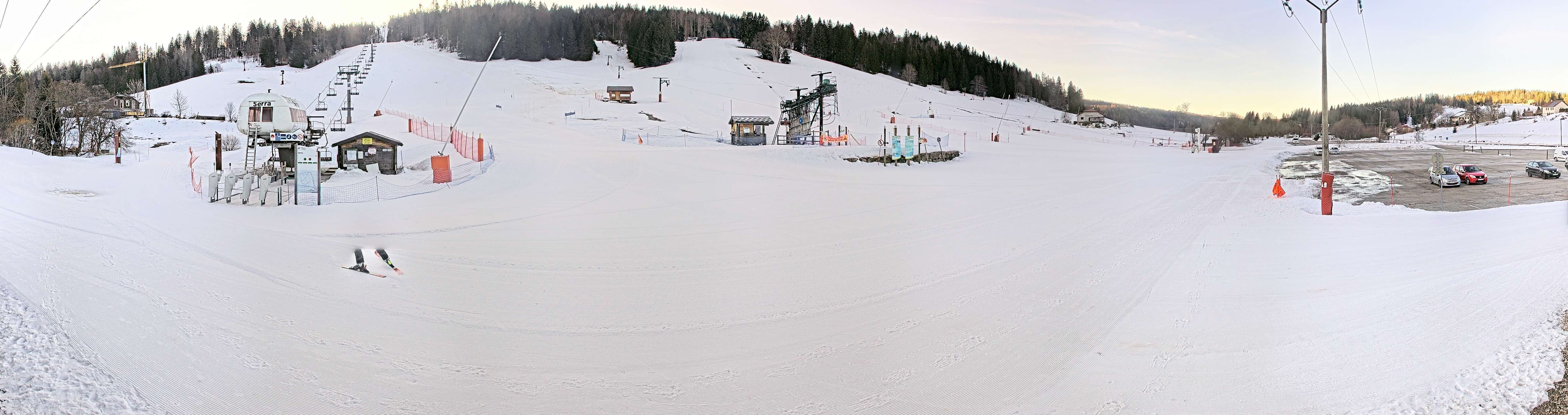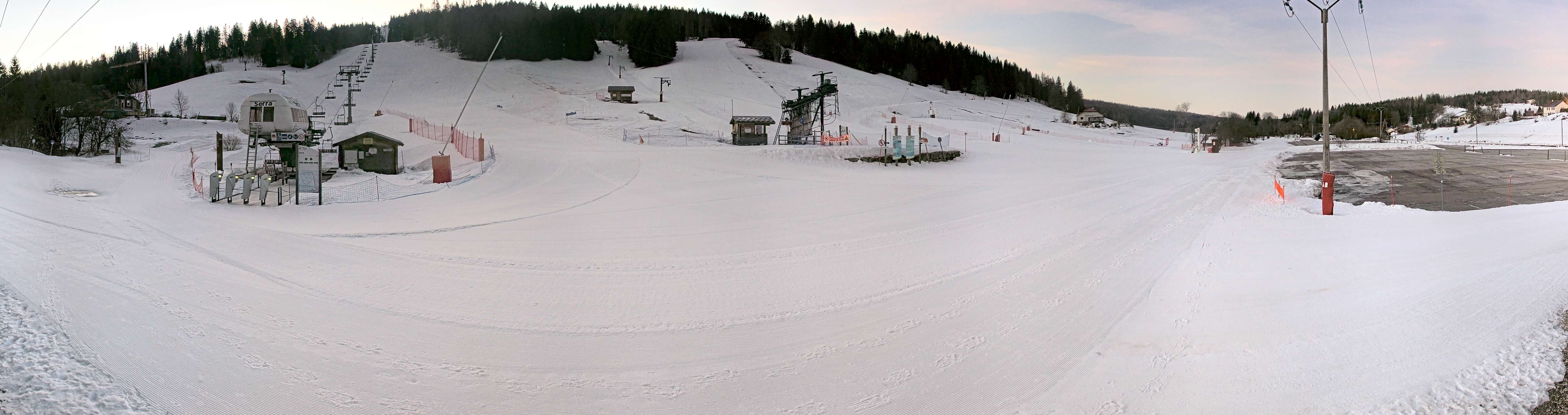 Zu sehen ist die Talstation der Lifte am Massif de la Serra im französischen Jura, Franche-Comté.