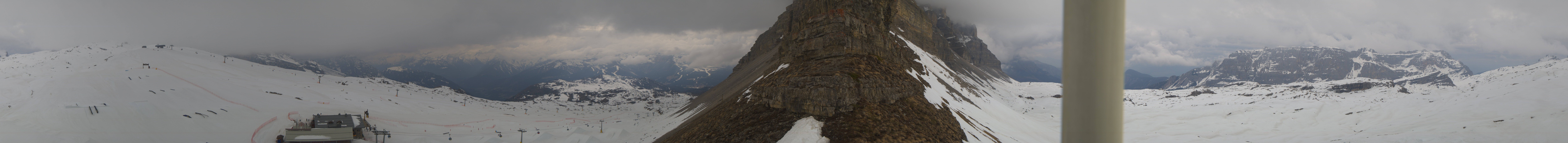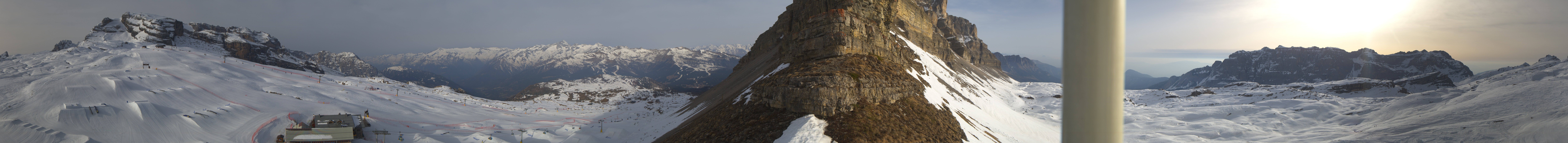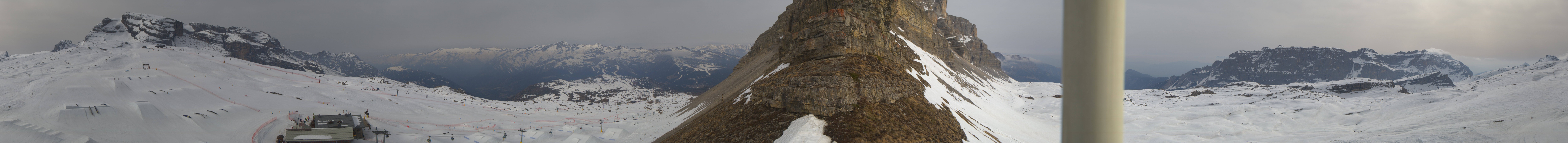Panoramablick auf den Cima del Grostè im Skigebiet Madonna di Campiglio. Zu sehen ist der Ursus Snowpark sowie die Gondelbahn und der Sessellift Grostè Express. An der Bergstation findest du das Rifugio Stoppani und unterhalb des Snowparks befindet sich das Rifugio Graffer.