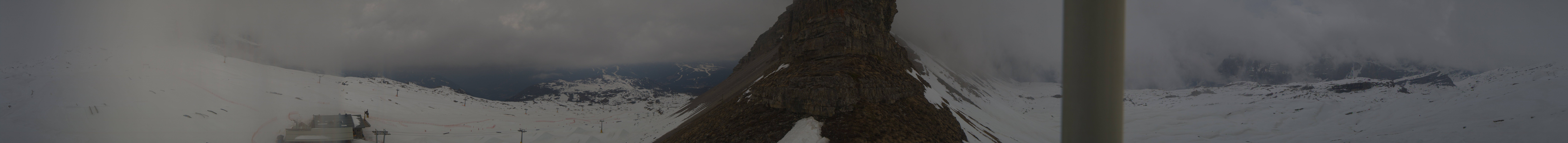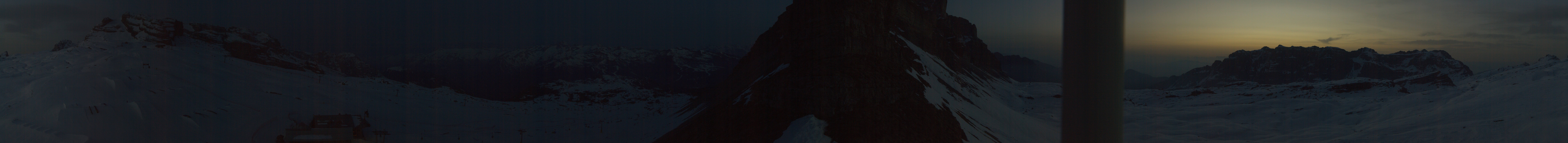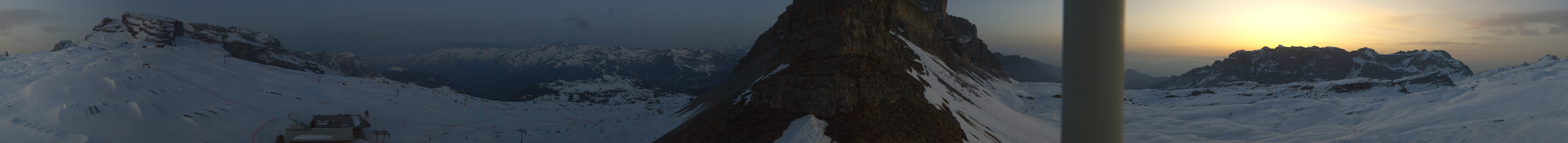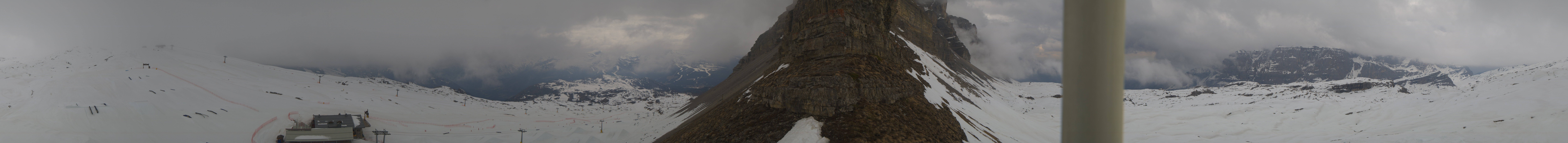 Panoramablick auf den Cima del Grostè im Skigebiet Madonna di Campiglio. Zu sehen ist der Ursus Snowpark sowie die Gondelbahn und der Sessellift Grostè Express. An der Bergstation findest du das Rifugio Stoppani und unterhalb des Snowparks befindet sich das Rifugio Graffer.