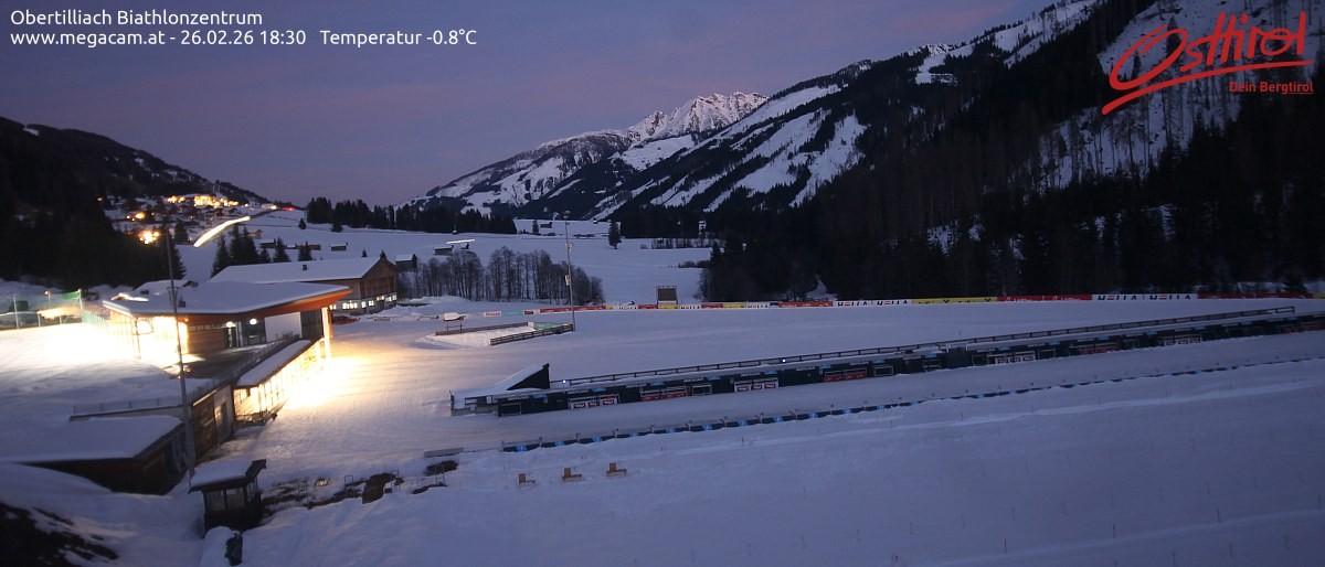 Archived webcam image showing Obertilliach biathlon centre on 26 Feb 2026 at 18:31 Aktuell