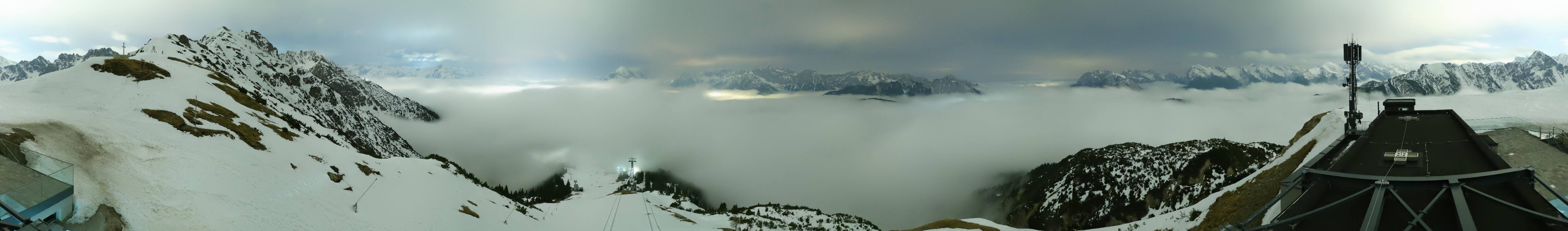 Genieße den Panoramablick von der Bergstation am Seefelder Joch im Skigebiet Rosshütte bis ins Tal nach Seefeld in Tirol. Zu sehen ist neben der Seefelder Jochbahn auch der Jochlift und der Sessellift Rosshütten-Express.