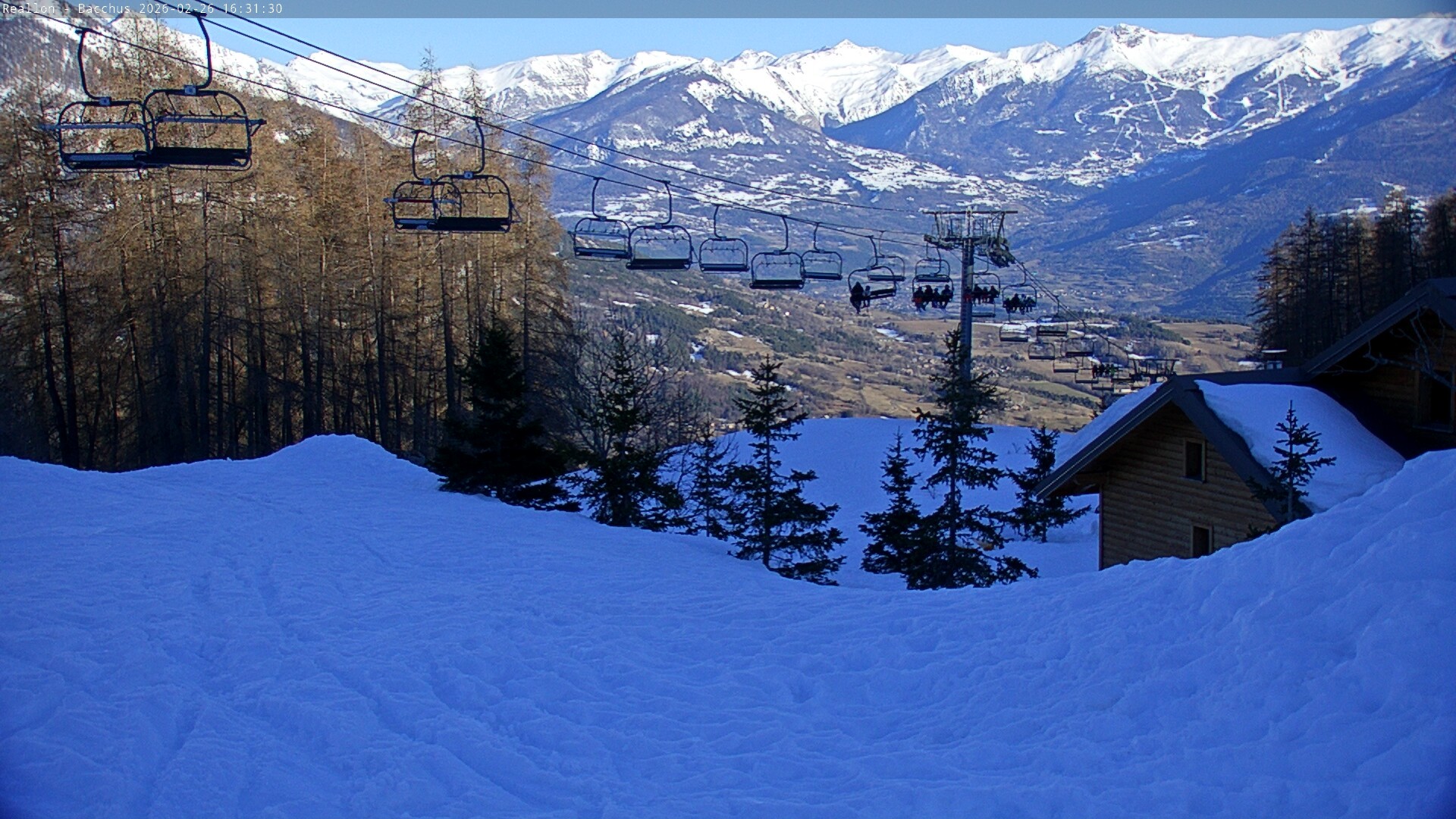 Archived webcam image showing Mountain station of the Chabrières chair lift on 26 Feb 2026 at 16:11 Aktuell