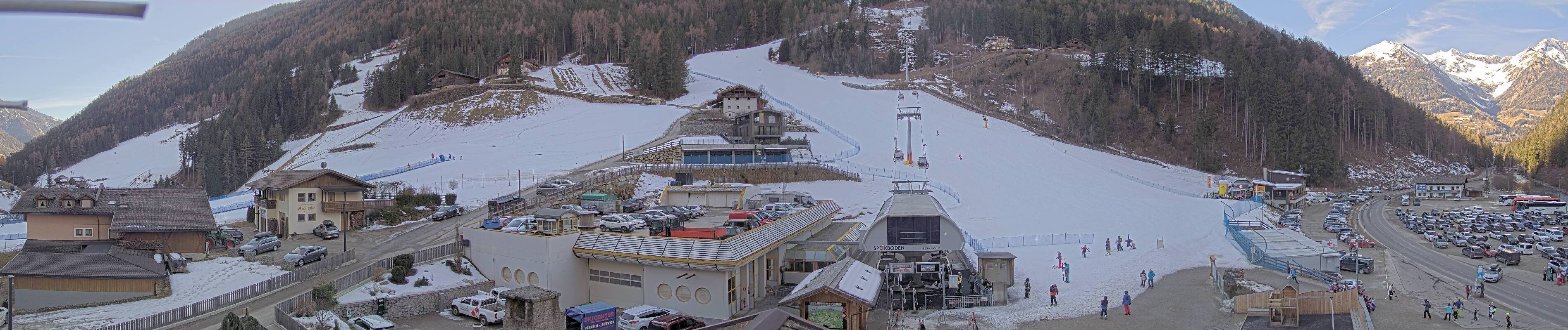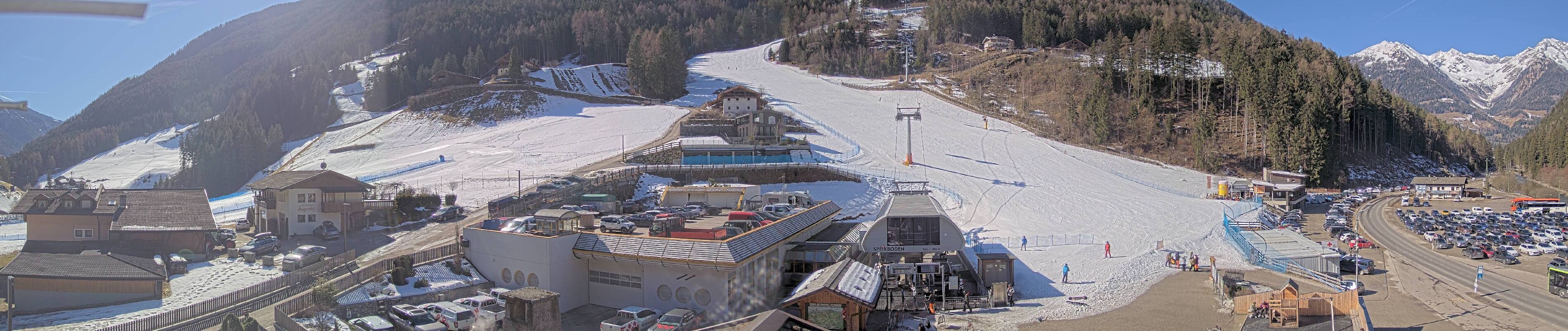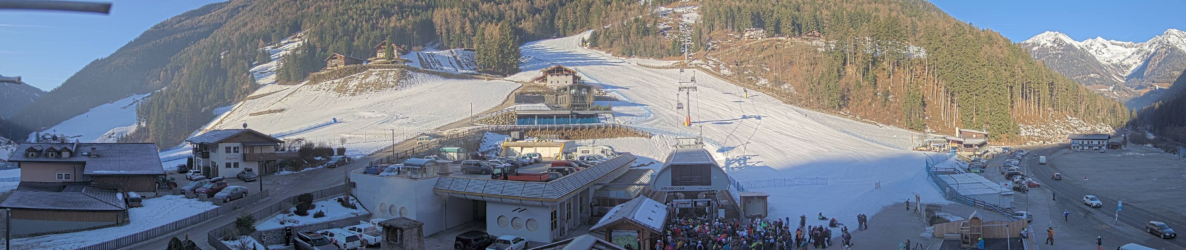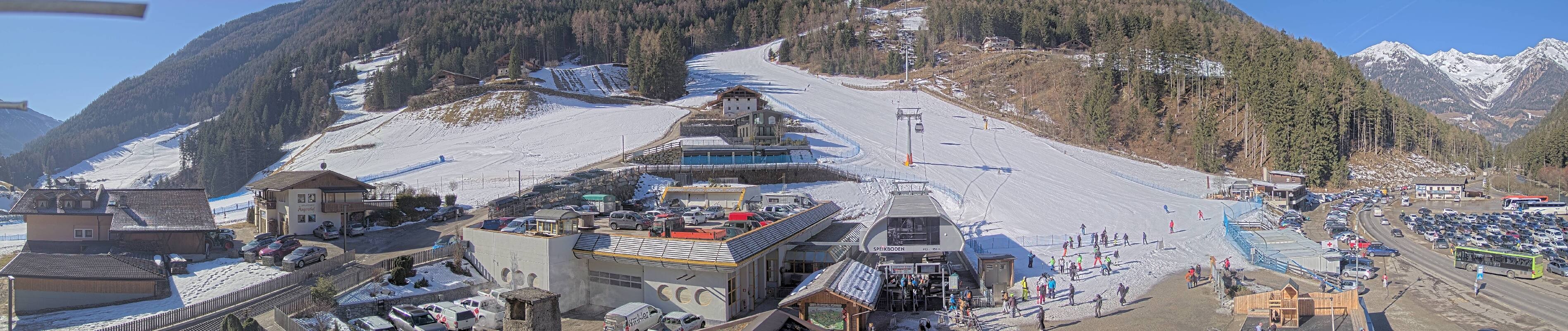 Blick auf die Talstation im Skigebiet Speikboden. Dort befindet sich auch ein großer Parkplatz und die Talstation der Bergbahn.
