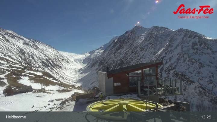 Die Webcam befindet sich an der Bergstation des Sessellifts Heidbodme und damit am höchsten Punkt des Skigebiets Saas-Almagell.