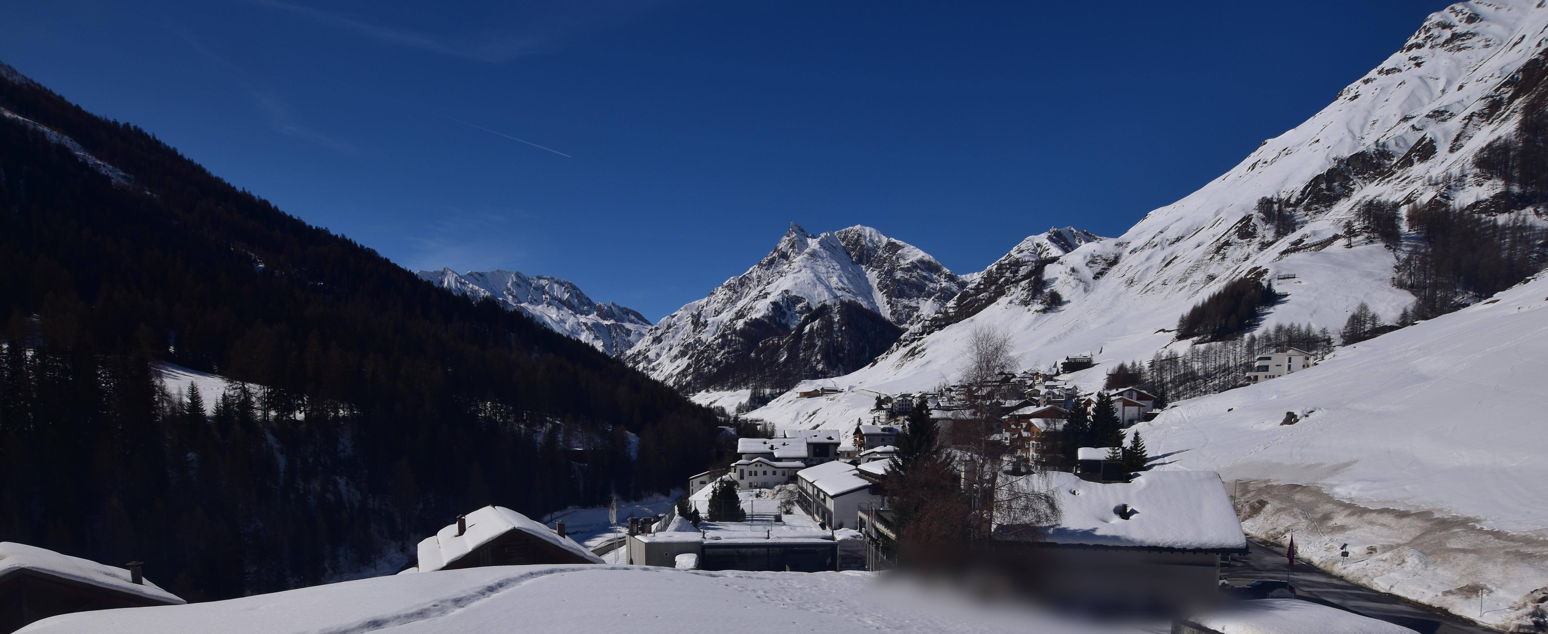 Blick auf das Dorf Compatsch auf 1.700m Höhe in der Region Samnaun