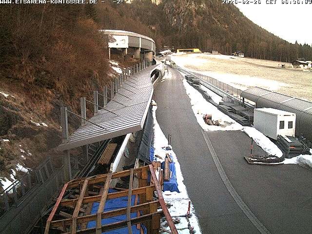 Archiviertes Webcam Bild: Eisarena Königssee: Blick auf die Bobbahn am 26 Feb 2026 um 08:10 Uhr 07:00
