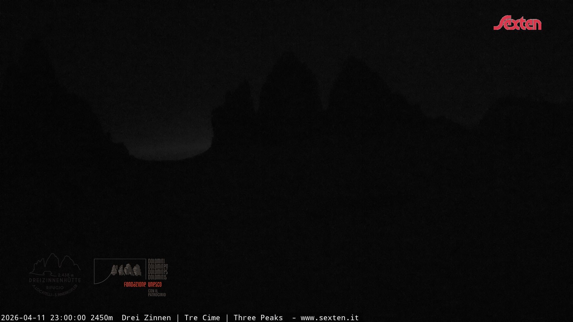 Archiviertes Webcam Bild: Dreizinnenhütte Südtirol: Blick auf die 3 Zinnen am 12.04.2026 um 00:59 Uhr 00:00