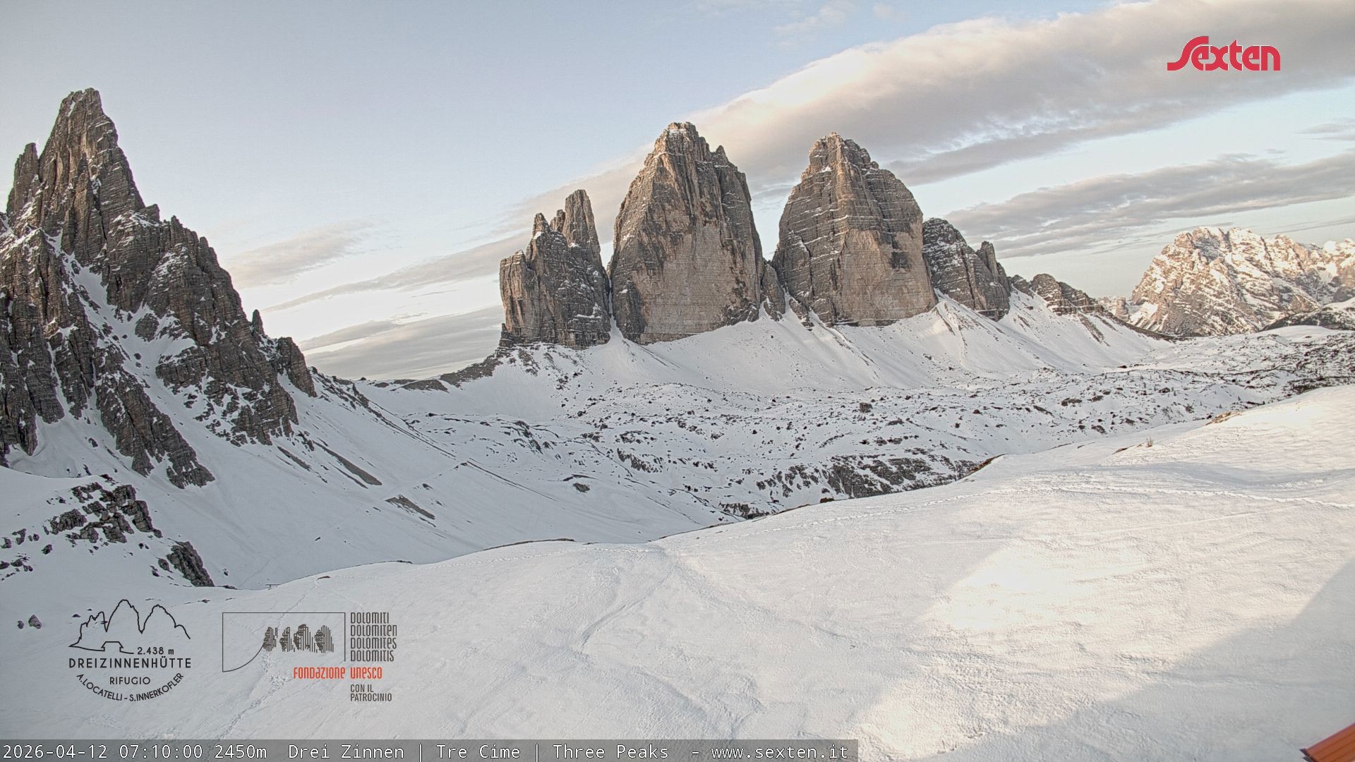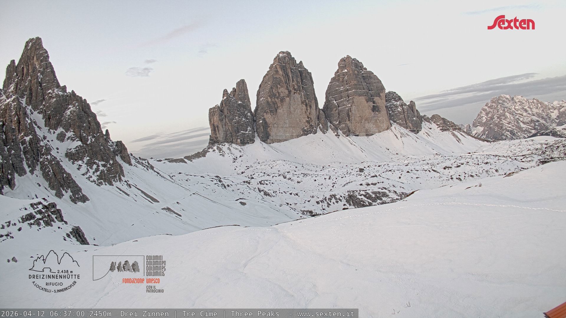 Archiviertes Webcam Bild: Dreizinnenhütte Südtirol: Blick auf die 3 Zinnen am 12.04.2026 um 07:59 Uhr 07:00