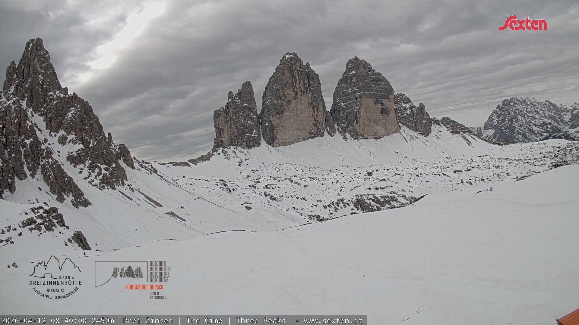 Archiviertes Webcam Bild: Dreizinnenhütte Südtirol: Blick auf die 3 Zinnen am 12.04.2026 um 08:59 Uhr 08:00