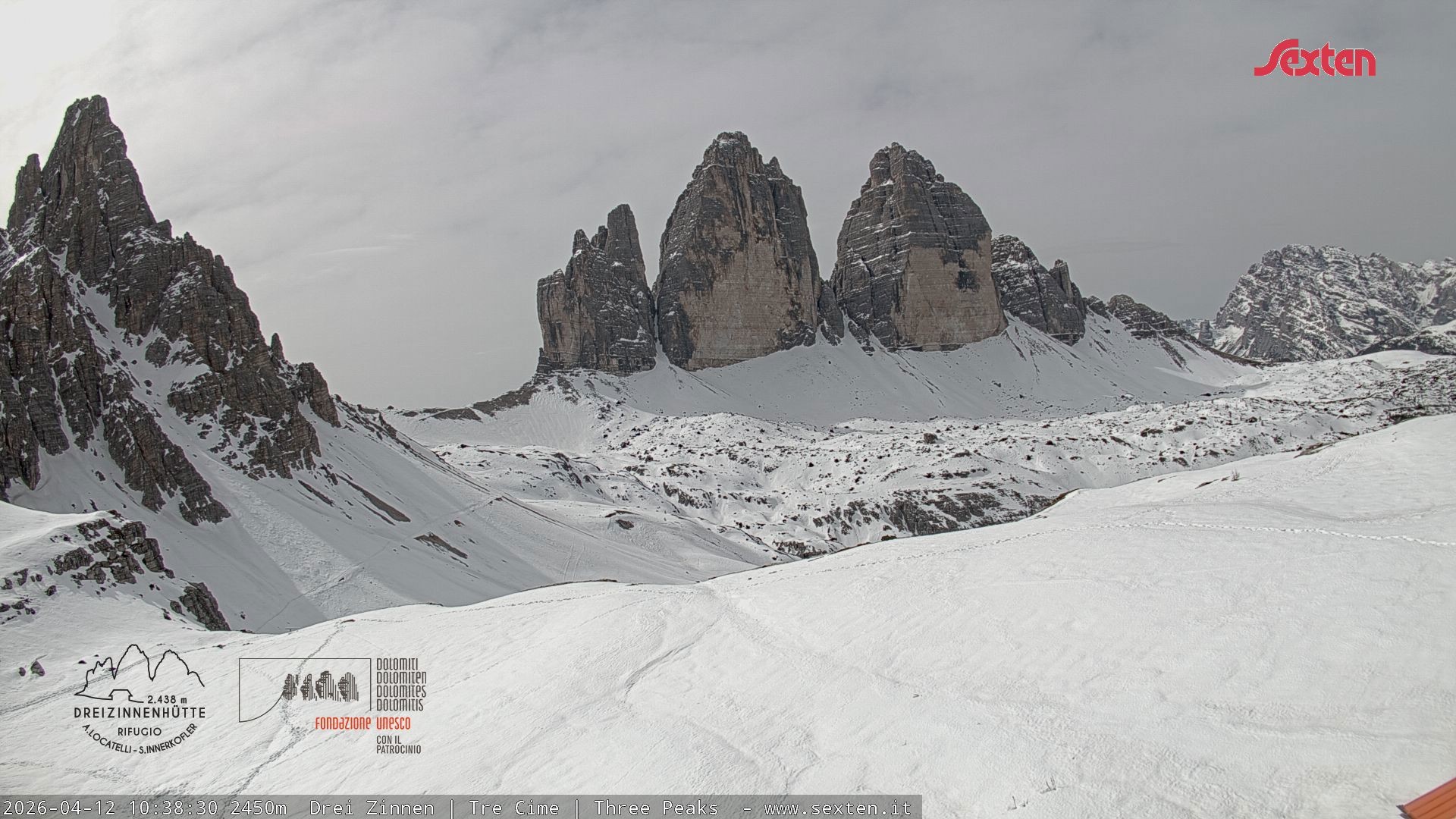 Archiviertes Webcam Bild: Dreizinnenhütte Südtirol: Blick auf die 3 Zinnen am 12.04.2026 um 12:59 Uhr 12:00