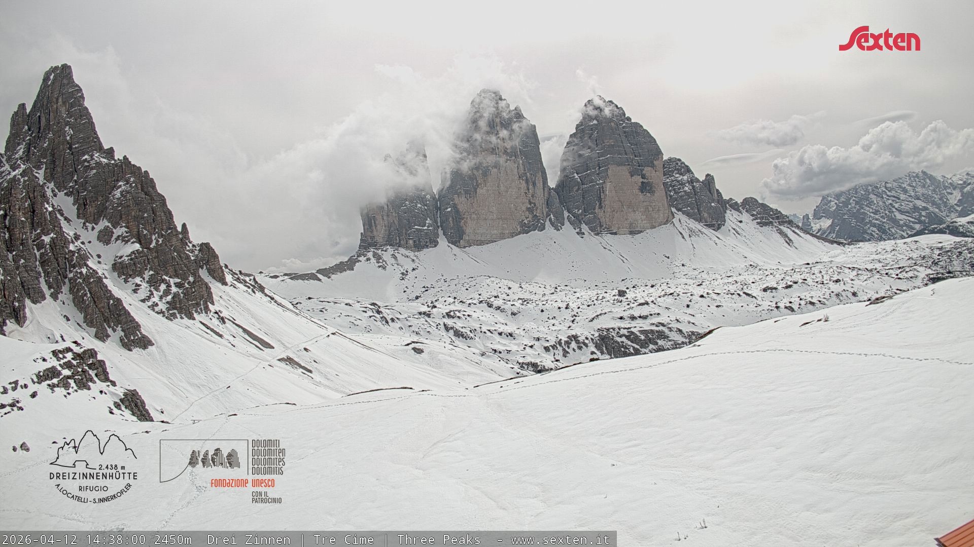 Archiviertes Webcam Bild: Dreizinnenhütte Südtirol: Blick auf die 3 Zinnen am 12.04.2026 um 14:59 Uhr 14:00