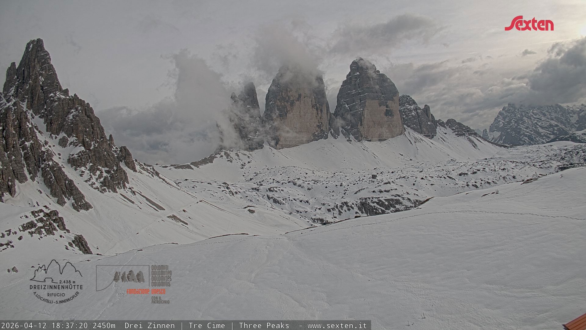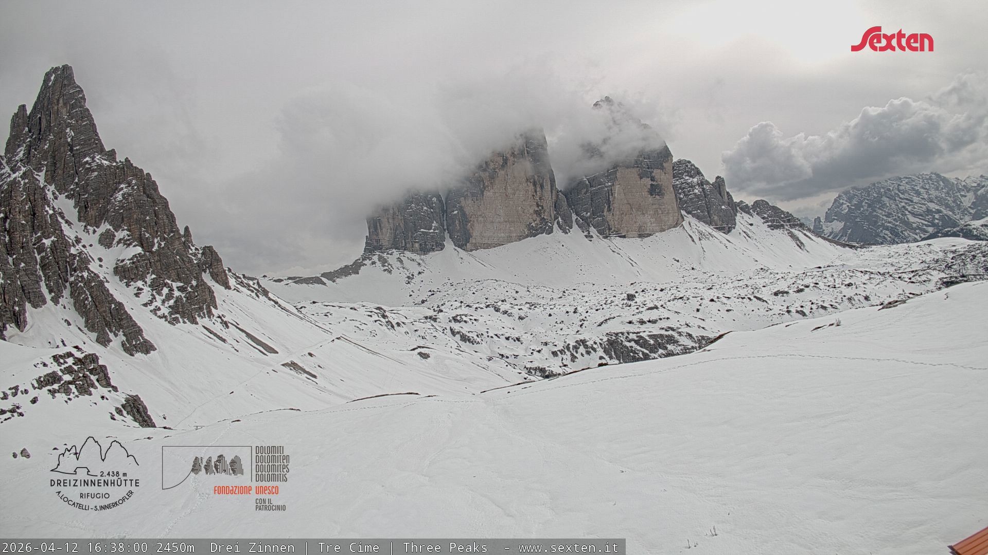 Archiviertes Webcam Bild: Dreizinnenhütte Südtirol: Blick auf die 3 Zinnen am 12.04.2026 um 16:59 Uhr 16:00