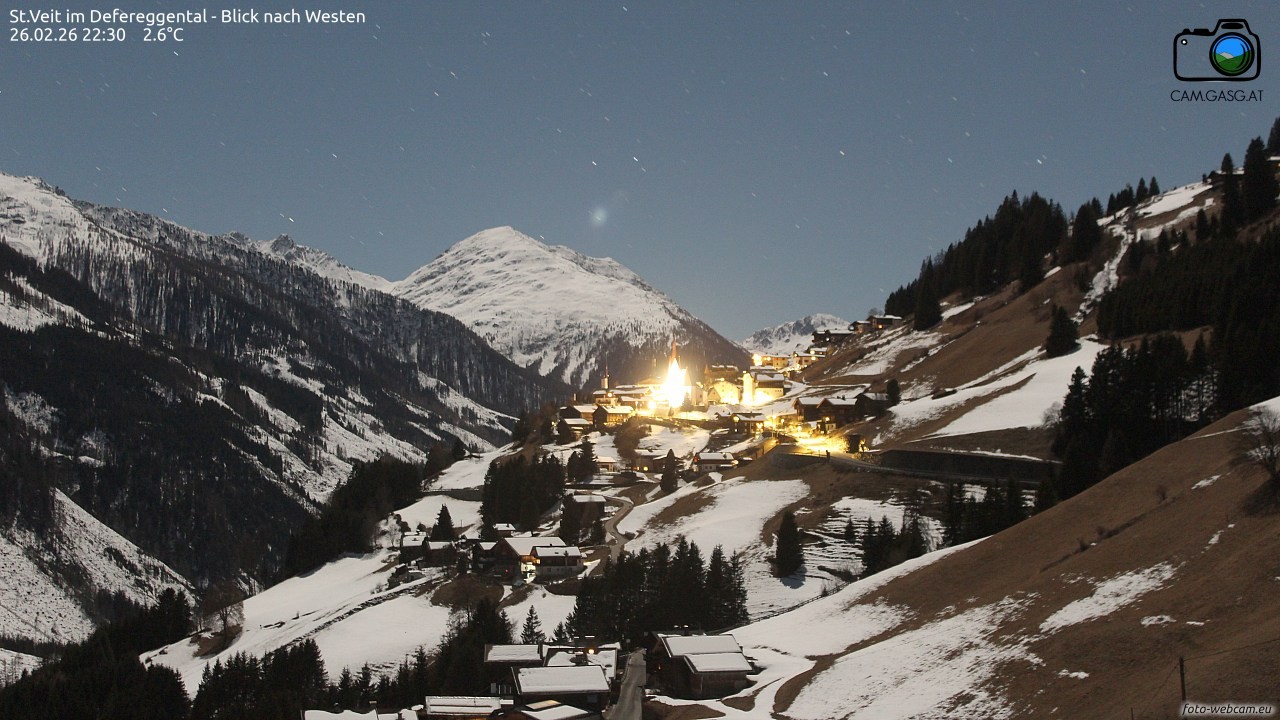 Blick auf St. Veit im Defereggental. Im Hintergrund erheben sich die Langschneid (mittig) und das Deferegger Pfannhorn (rechts). Blickrichtung: Westen