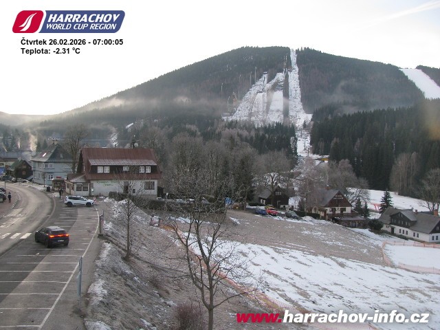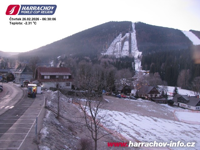Archived webcam image showing ski-jumping hill Čerťák on 26 Feb 2026 at 07:45 06:00