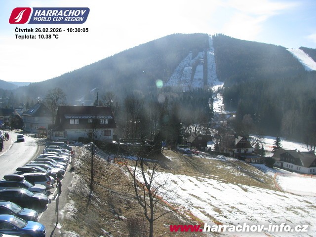 Archived webcam image showing ski-jumping hill Čerťák on 26 Feb 2026 at 14:45 Aktuell