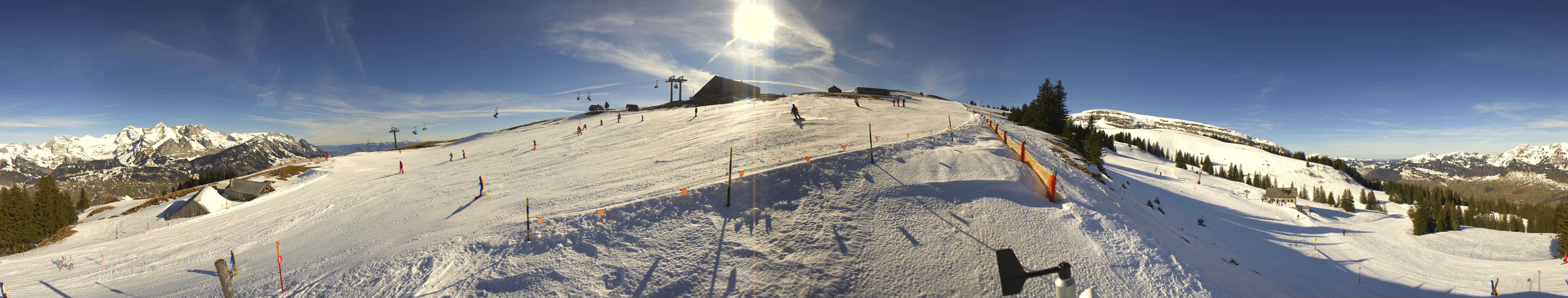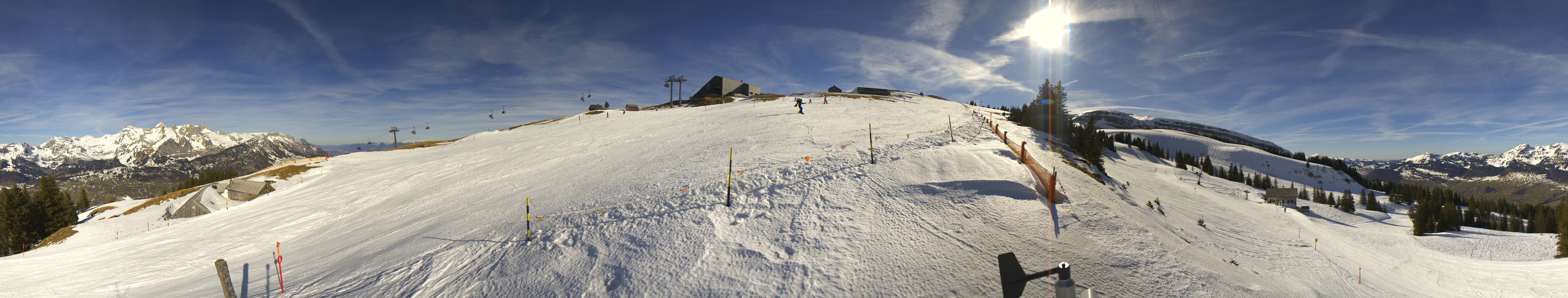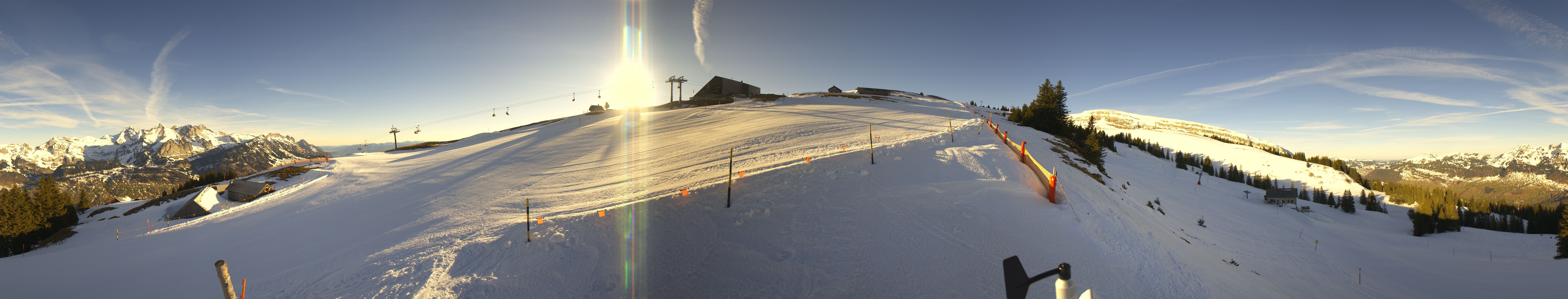 Direkt auf der Gamsalp im Schweizer Skigebiet Wildhaus Bergbahnen bei Toggenburg gelegen, bietet die Roundshot-Cam einen fantastischen 360-Grad-Blick über die umliegende Berglandschaft, den Gamsalp-Gamserrugg Skilift sowie das Bergrestaurant Gamsalp.