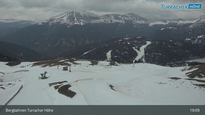 Archiviertes Webcam Bild: Live Cam Turracher Höhe: Panoramablick Kornock am 12.04.2026 um 19:43 Uhr 19:00